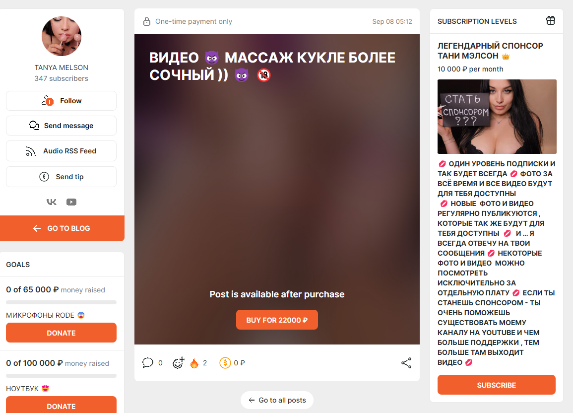 тупица могла просто сделать нормальный ценник в 1К и заливать на бусти лайтовые фотки и видео, а самый сок продавать в приватке в телеге, получая почти всю сумму. так или иначе есть небольшая комиссия донат бота, либо вообще через личку можно прямыми переводами получать без комиссий.