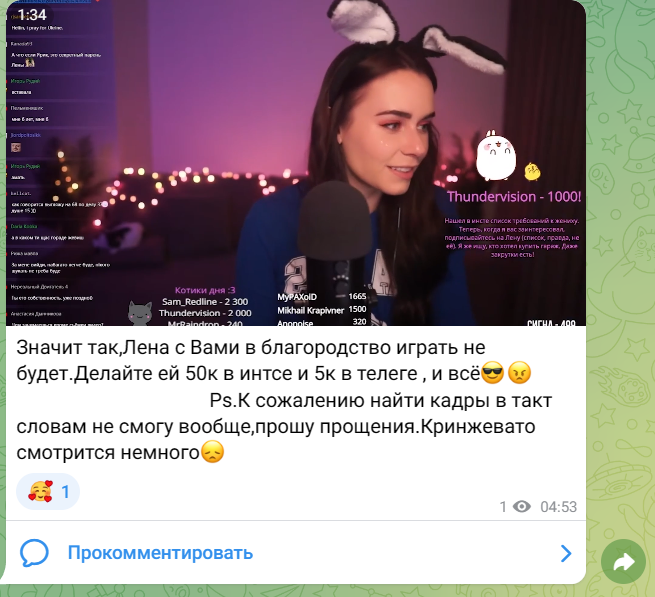 Сегодня рейн ворвался на стрим и сказал что его не будет на этом стриме, думаю этот стрим войдет в аналы истории. Вот так Лена, уже даже самые преданные котятки отворачиваются.