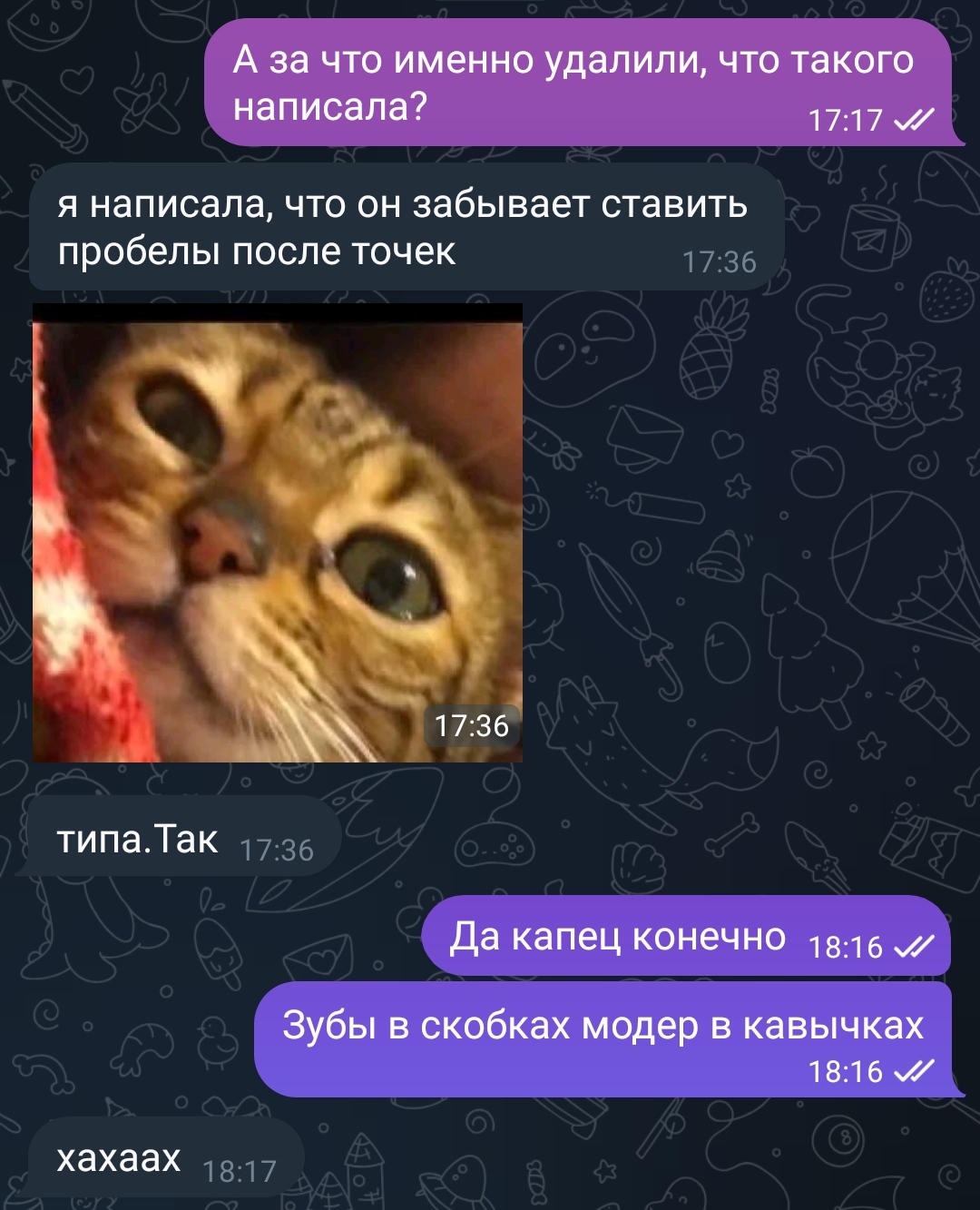 >>139421 Ну и её модераторам тоже стоит отдать должное. У Лены вообще большой талант собирать во круг себя разного рода дегенератов, а некоторым ещё и выдавать модерки. Во первых, нужно разобраться за что ему выдали бан, во вторых, какого хуя этот бигбоссхер позволяет себе использовать бранную лексику, пусть и в зацензуреной форме.
