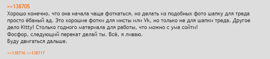 >>138705 Хорошо конечно, что она начала чаще фоткаться, но делать из подобных фото шапку для треда просто ёбаный ад. Это хорошие фотки для инсты или Vk, но только не для шапки треда. Другое дело Kitty! Столько годного материала для работы, что можно с ума сойти! Фосфор, следующий перекат делай ты. Всё, я ливаю. Буду двигаться дальше.