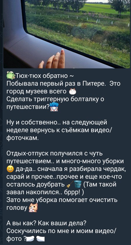 Пиздец. Последний нормальный видос был в начале июля. До сих пор тишина полная, я понимаю что уезжала, но и в дороге можно было выдать, хоть что-то интересное. Тем более опыт Турции есть. Не удивлюсь, если после все этой тишины, она нас одарит ещё убогим ликингом за фул прайс.