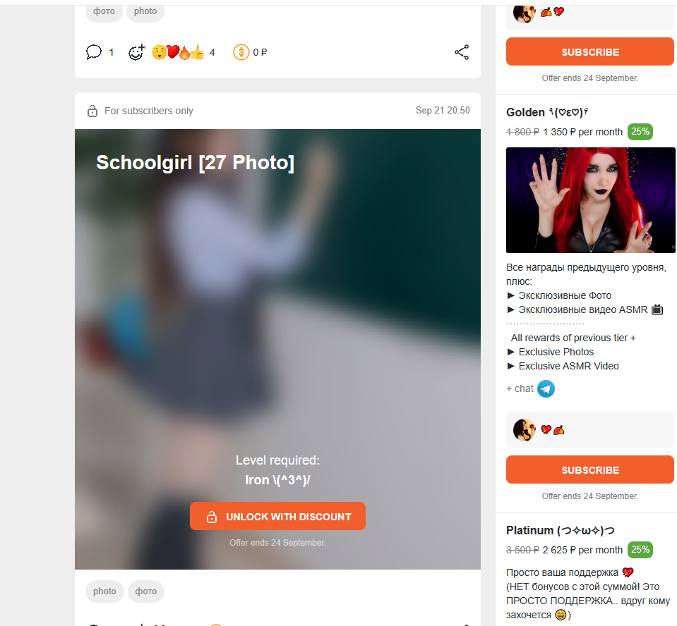 >>145749 >Я могу Быть вообще не подписан Да. Тупанул. Забыл это указать выше. Лень было дополнять. В этом случае тем более тебе должно быть похуй, в какие тиры или уровни она ставит тот или иной контент. Ты за него не платишь. >>145749 >Чисто претензия Не имеющая имхо под собой оснований. Она достаточно контента выпускает за месяц для 25 долларовой подписки. Естественно включая уровни ниже. Да ещё и по сравнению с другими ру. Снимаю шляпу за трудолюбие и не проёбчивость. Был подписан пару раз. Лучшее что она выдаёт это фотки. Видосы норм, раз в три месяца - пол года.