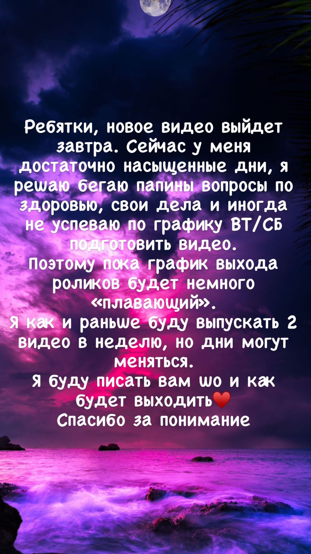 А на стриме сказала, что на 90% новое видео выйдет сегодня (хотя до этого вообще были обещания про четверг-пятницу), а получается опять отложила на последний обещанный день, т.е. на завтра - видать спецом как всегда растягивает, чтобы на следующей неделе запилить лишь один видосик, типа не хватает времени, вся в делах, ой, так получилось, извините, ребятки-котятки.