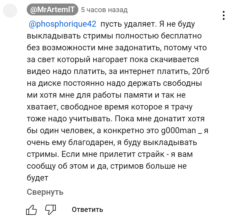 А ну и ещё вспомнил что он банит не только в комментариях и чате, а ещё и на самом канале в чс заносит, так что ты не можешь смотреть даже записи канала :D