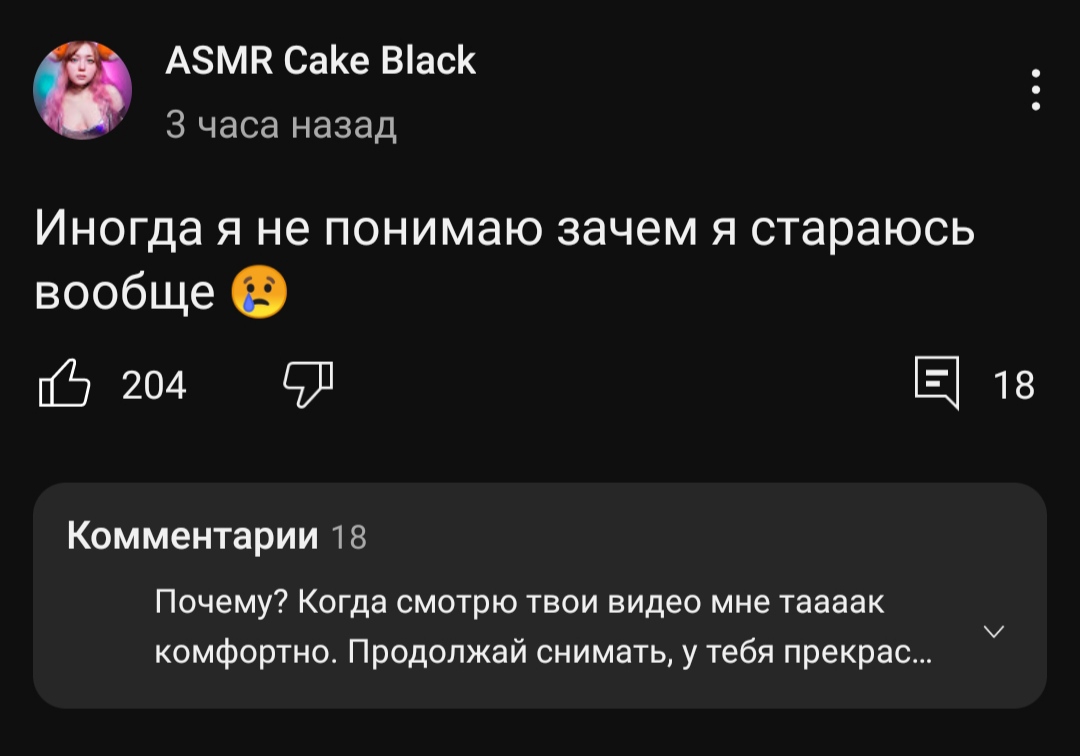 Алёна достала своим однотипным "глоточек чаёчка, чаёчка глоточек" и "кошмаррр кокойты". Человек не развивается вообще, не пробует интересные триггеры и форматы, всё очень уныло. Плюс она пытается играть пик ми гёрл, когда с такой мордахой найти питательного, чтобы сесть на него, ой как трудно. Моё бы ей порекомендовало вернуться на обычную работу, параллельно чему-то учась. Ну или согласиться быть женой скуфаря какого-нибудь.