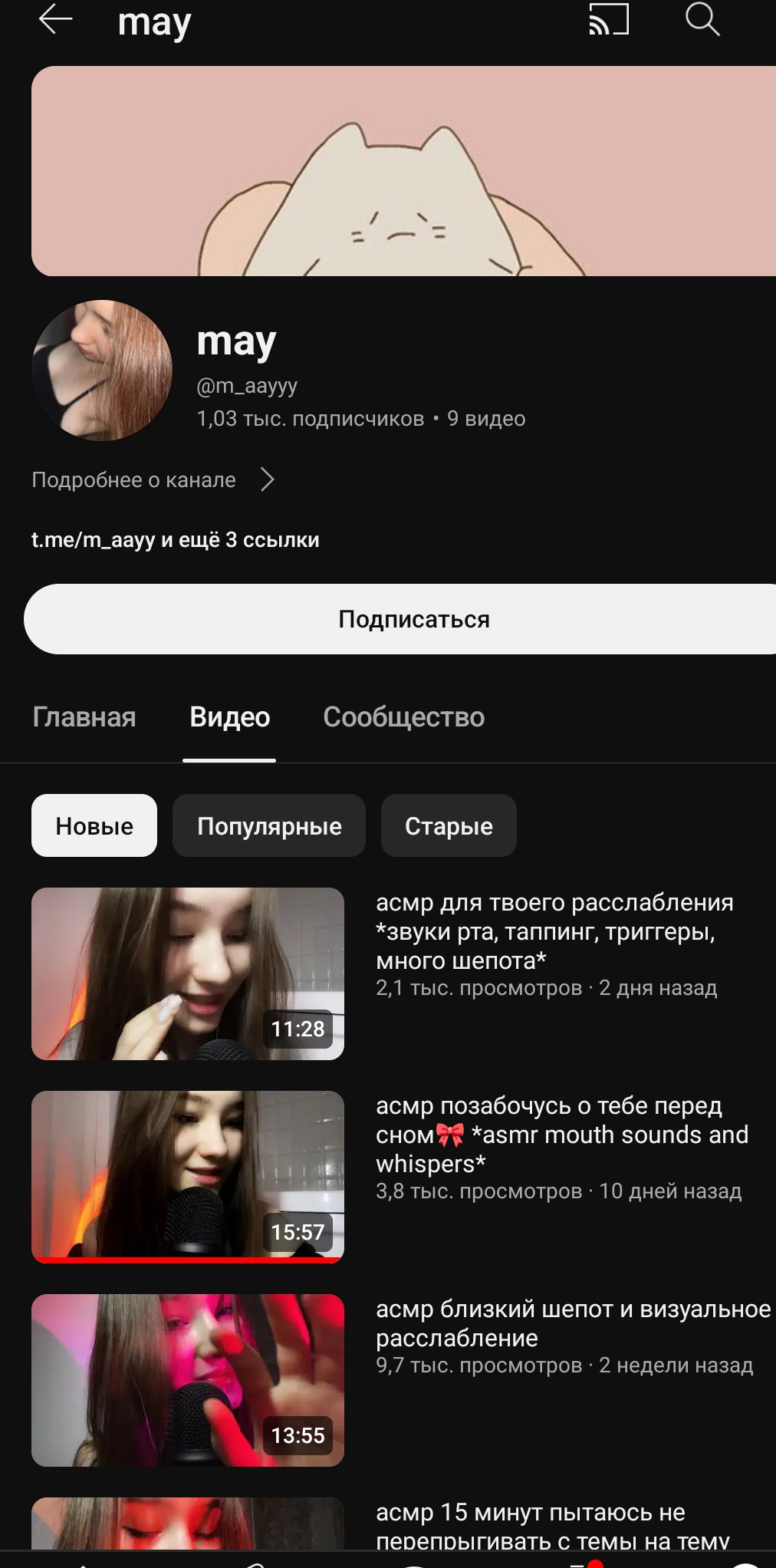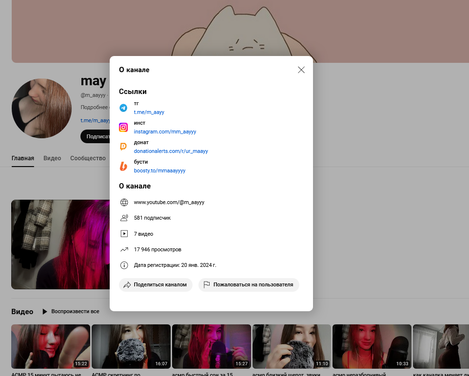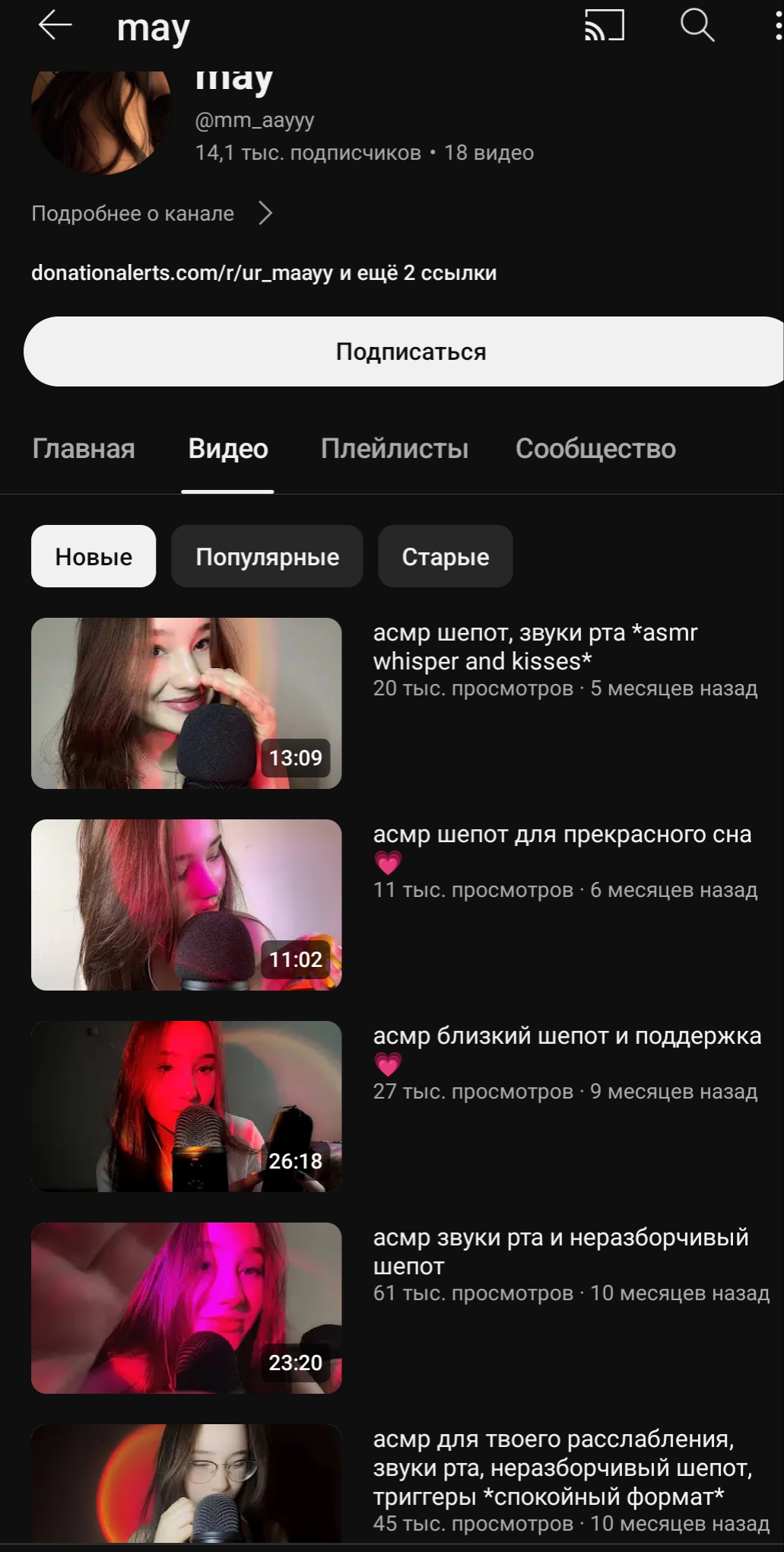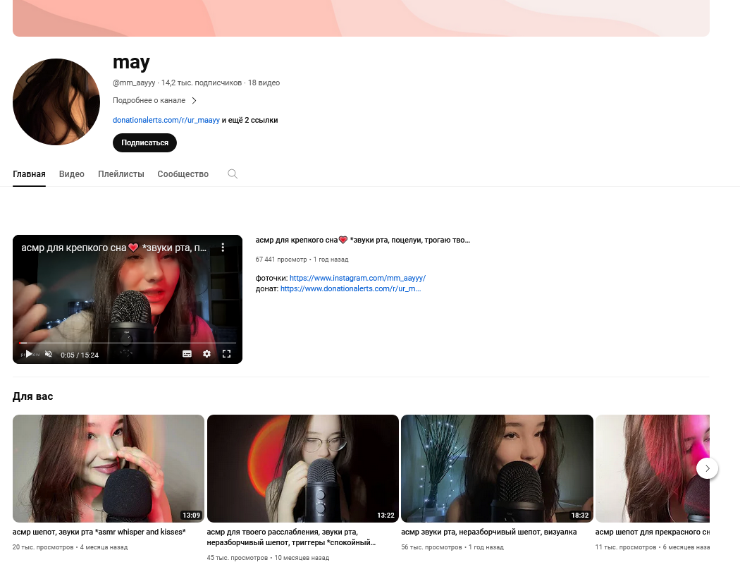 https://www.youtube.com/@m_aayyy вроде банальный канал очередной асмр девочки, но недавно у неё появилась всё та же, банальная, очередная приватка именуемая как бусти, контент там вполне смотрибельный(до этого она хотела открыть приват в тг и постить там своё тело, но из личной переписки я узнал что парень её немного против этого, но сейчас имеем что имеем) boosty.to/mmaaayyyy