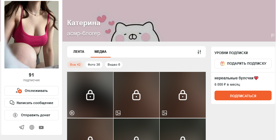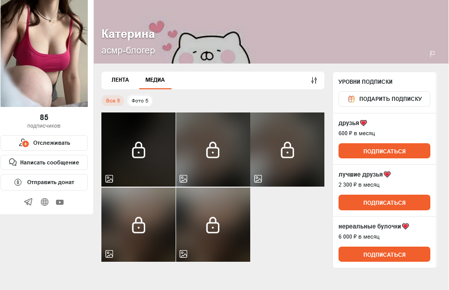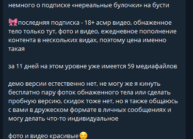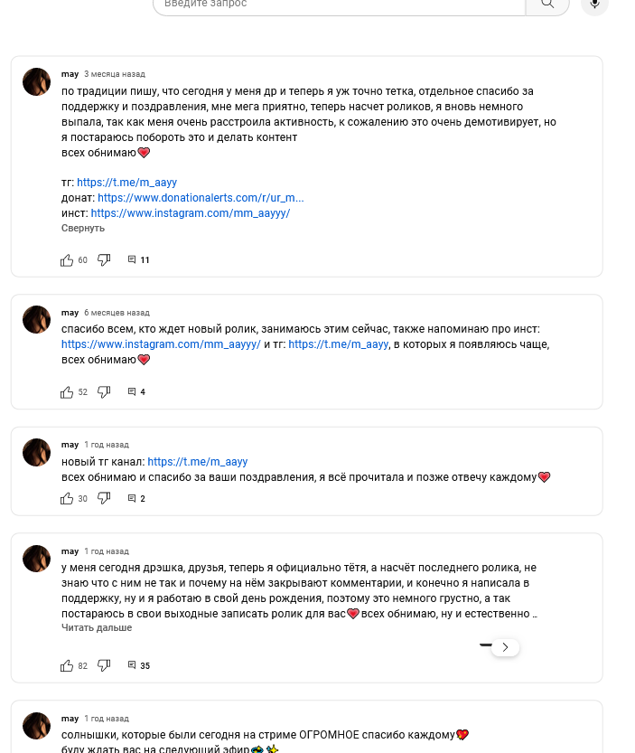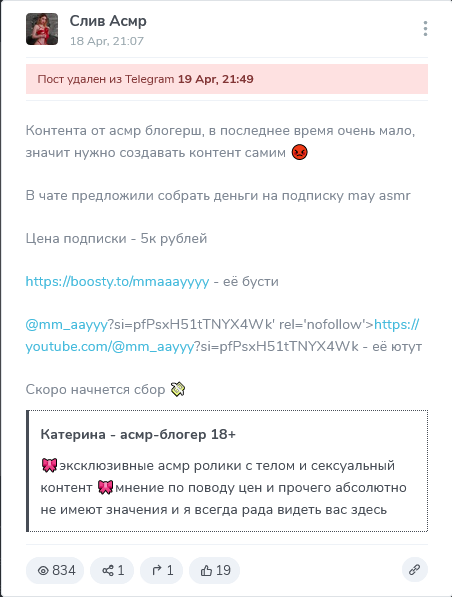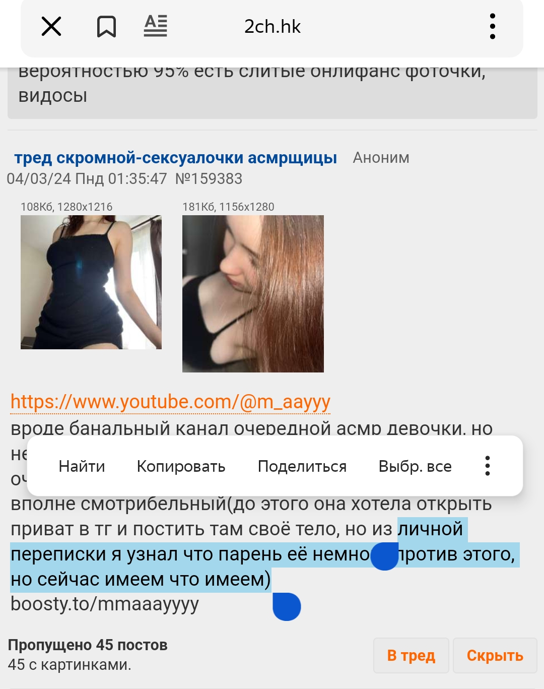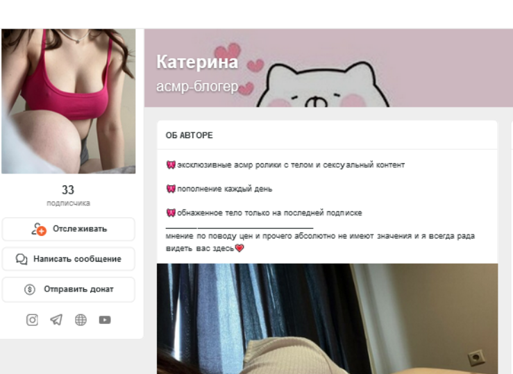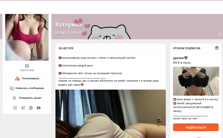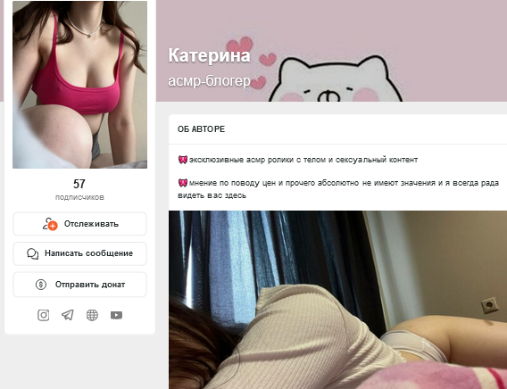 https://www.youtube.com/@m_aayyy вроде банальный канал очередной асмр девочки, но недавно у неё появилась всё та же, банальная, очередная приватка именуемая как бусти, контент там вполне смотрибельный(до этого она хотела открыть приват в тг и постить там своё тело, но из личной переписки я узнал что парень её немного против этого, но сейчас имеем что имеем) boosty.to/mmaaayyyy