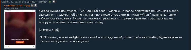 думала думала придумала.. (мой личный сове - удали и не порти репутацию не чсв , как о тебе сказали тут и адекватной а не как я лично думаю о тебе что ты тупая хуйня) * поясню за тупую хуйню-пост выложен в 4 утра, ты лежала с гражданским мужем в кровати и сфоткала задниу которую он шлёпал своими яйами час назад.