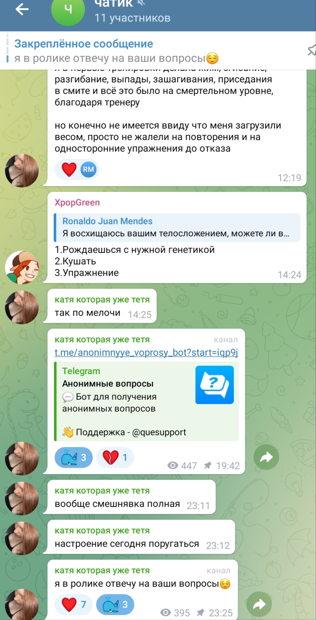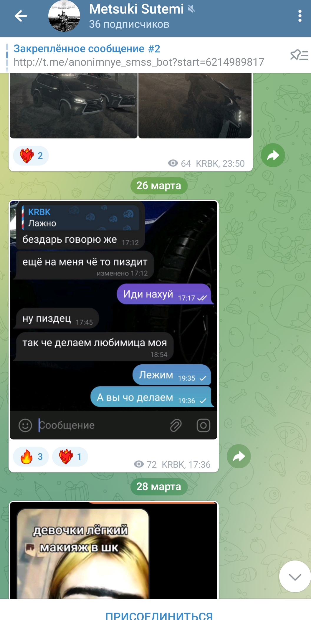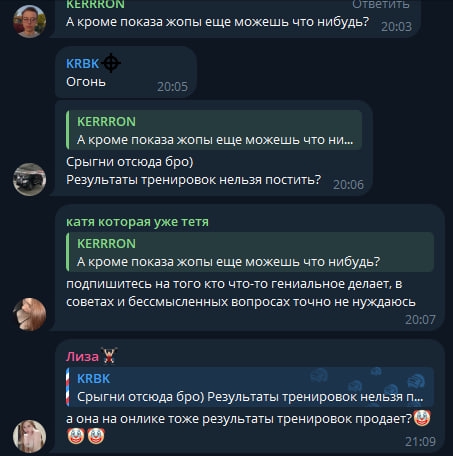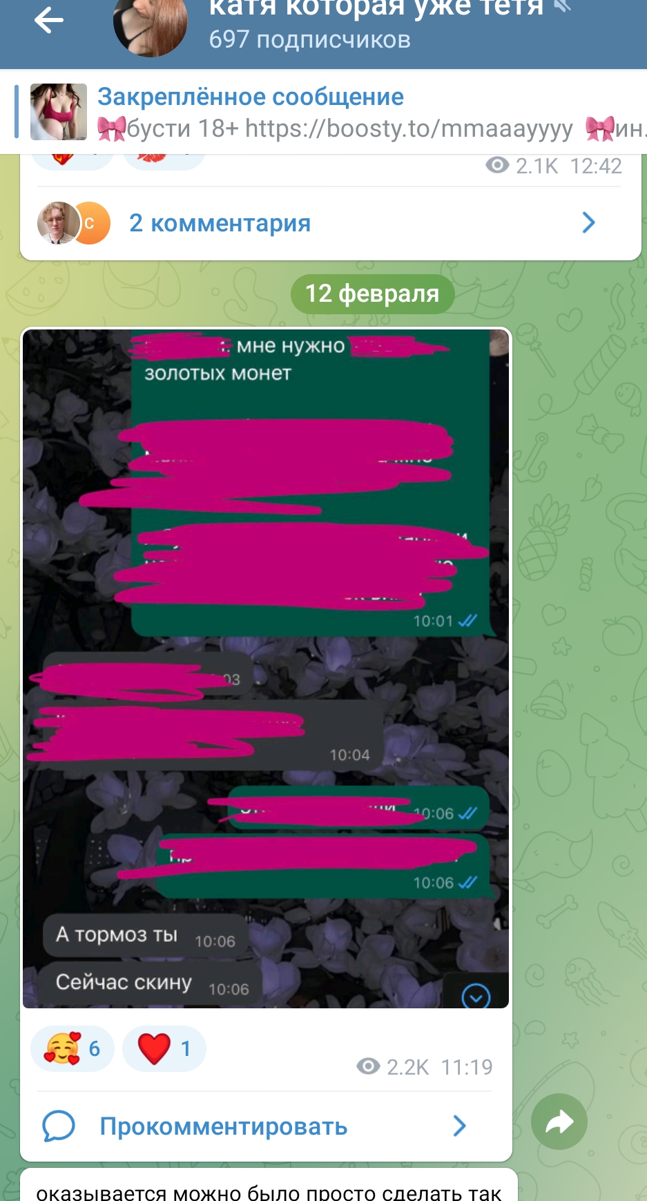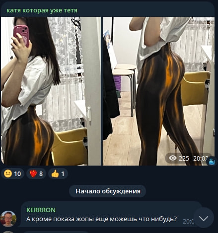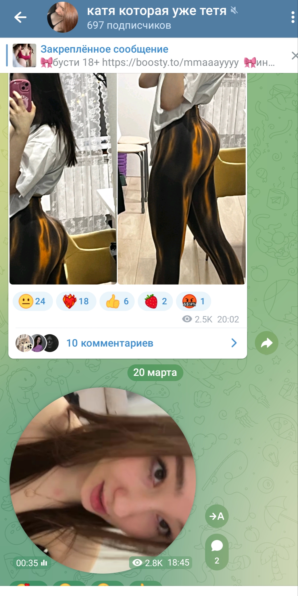 2. ЕЁ ТЕЛЕГРАМ - ПРОЛИСТАЛ ВЕСЬ. МОЙ ВАМ СОВЕТ. ЛУЧШ ТУДА НЕ ЗАХОДИТЬ. ТАМ ЛИШЬ ОДНО НЫТЬЕ ПРО БЫВШЕГО И НОВОГО, КОТОРЫЙ МУЖ, ДА ОНА В БРАКЕ С КОЛЬЦОМ И ЕЙ 20 А ЕМУ ПОЧТИ 30. И ДА ОН НЕ ПЕВРЫЙ ЕЁ. ВСЯ ТЕЛЕГА У НЕЁ ПРО ТО КАК ОНА КАЧАЕТ ЖОПУ, ВСПОМНАЕТ БЫВШЕГО, ГОРДИТСЯ МУЖЕМ И В 22 ГОДУ БУДУЧИ 18ЛЕТНЕЙ ОНА ОПЫТНА В ЕБЛЕ УЖЕ БЫЛА. ПРИЧЕМ ОАН НА СЕРЬЕНЫХ ЩАХ ОБЩАЕТСЯ С ФАНАМИ - ПОЛТОРА КОЛЕКИ КОТОРЫЕ ВИДИМО И ЕСТЬ БЫВШИЙ И МУЖ ЕЁ КОММЕНТЯТ.