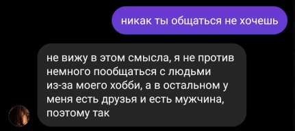 >>160251 - спорить не буду но не думаю что хочется себя ощущать шлюхой, я в этом плане про чсв. - мне незачем ей писать и она вряд ли хотла бы просто со мной поболтать.