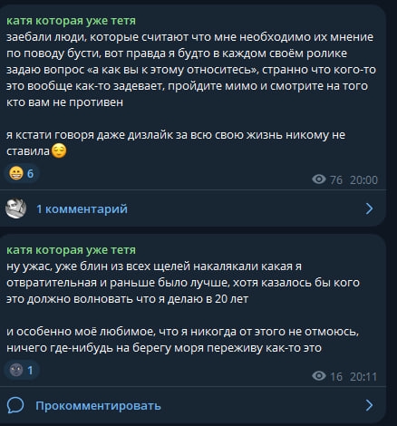 она в свои 20 должна пилить контент как не в себя как у лучшие годы муна и китти, но наверное и они тоже ныли тоже, сейчас попривыкли уже к хейту и прочему.