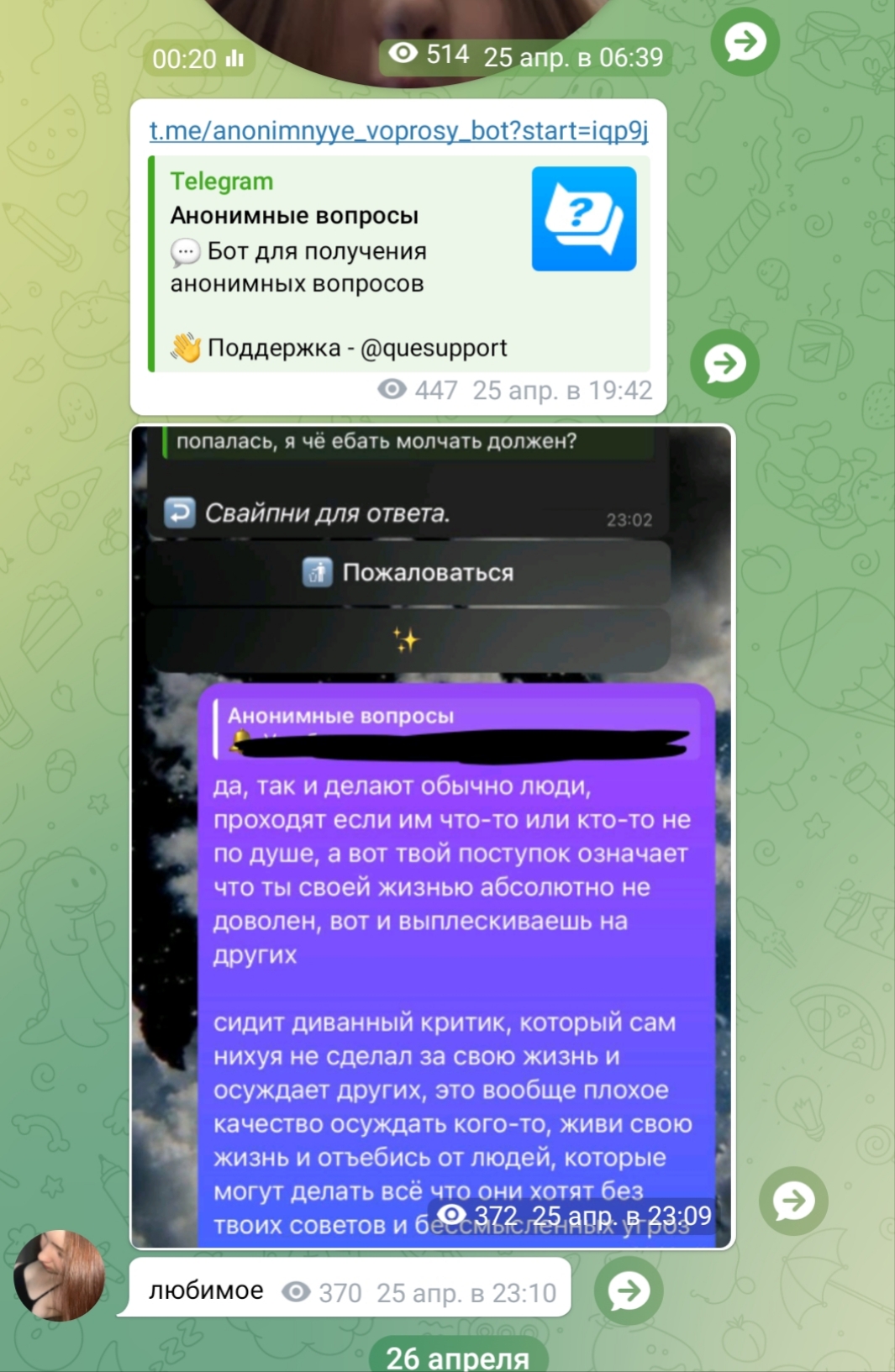 >>161244 мне нравится, как она ведётся на манипуляции с реакциями. я лично первый поставил ржущий смайл с её этой рекламы типа скоро на бусти видос с платьем. утром чекаю, поста нету. ну мне почему то кажется что именно с этого она и удалила. чисто детское поведение, не оценили - расстроилась ушла. ржущей реакции(не простого смеха), уже нету кстати, что подтверждает слова. я думаю в течении года ведения бусти она сломается. ребёнок который думает что мир упадёт к её ногам, глубоко разочаруется. и чел который якобы её парень тоже сломается от её хотелок рано или поздно. жопа у неё конечно охуенная(имхо), но думать что жопа у неё у одной во вселенной, очень глубокая ошибка) нахуй надо тратить 5к на жопу без лица(а лицо на самом деле влияет сильно ты знаешь что это она и её жопа), ну хз меня вставляет с лиц, может кому то похуй. и типа любой адекватный чел пойдёт подрочит на качественную порнуху забесплатно, или на любой качественный слив с лицом другой девки. короче такие мысли :D дай бог здоровья кто осилил столько текста, знаю многие это не любят, и ничего сверъестественного я тут не сказал