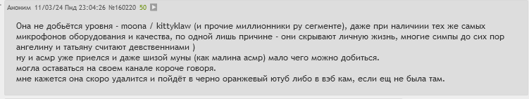 Она не добьётся уровня - moona / kittyklaw (и прочие миллионники ру сегменте), даже при наличиии тех же самых микрофонов оборудования и качества, по одной лишь причине - они скрывают личную жизнь, многие симпы до сих пор ангелину и татьяну считают девственниами ) ну и асмр уже приелся и даже шизой муны (как малина асмр) мало чего можно добиться. могла оставаться на своем канале короче говоря. мне кажется она скоро удалится и пойдёт в черно оранжевый ютуб либо в вэб кам, если ещ не была там.