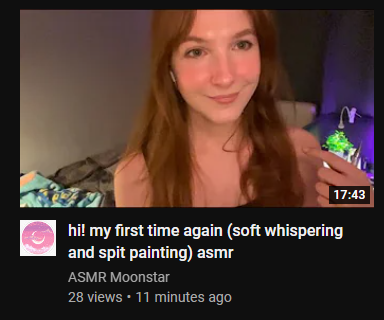 >>162170 Просто рыночек порешал. АСМР уже давно нахуй никому не нужен в своем первоначальном виде. Всякие шаболды влетали на новую ячейку ютюба асмр, но нихуя толкового не могли предложить кроме ссылки на онлик и тд, где сосут дилдаки, чмокают клитором. Настал пик длядолизации асмр.