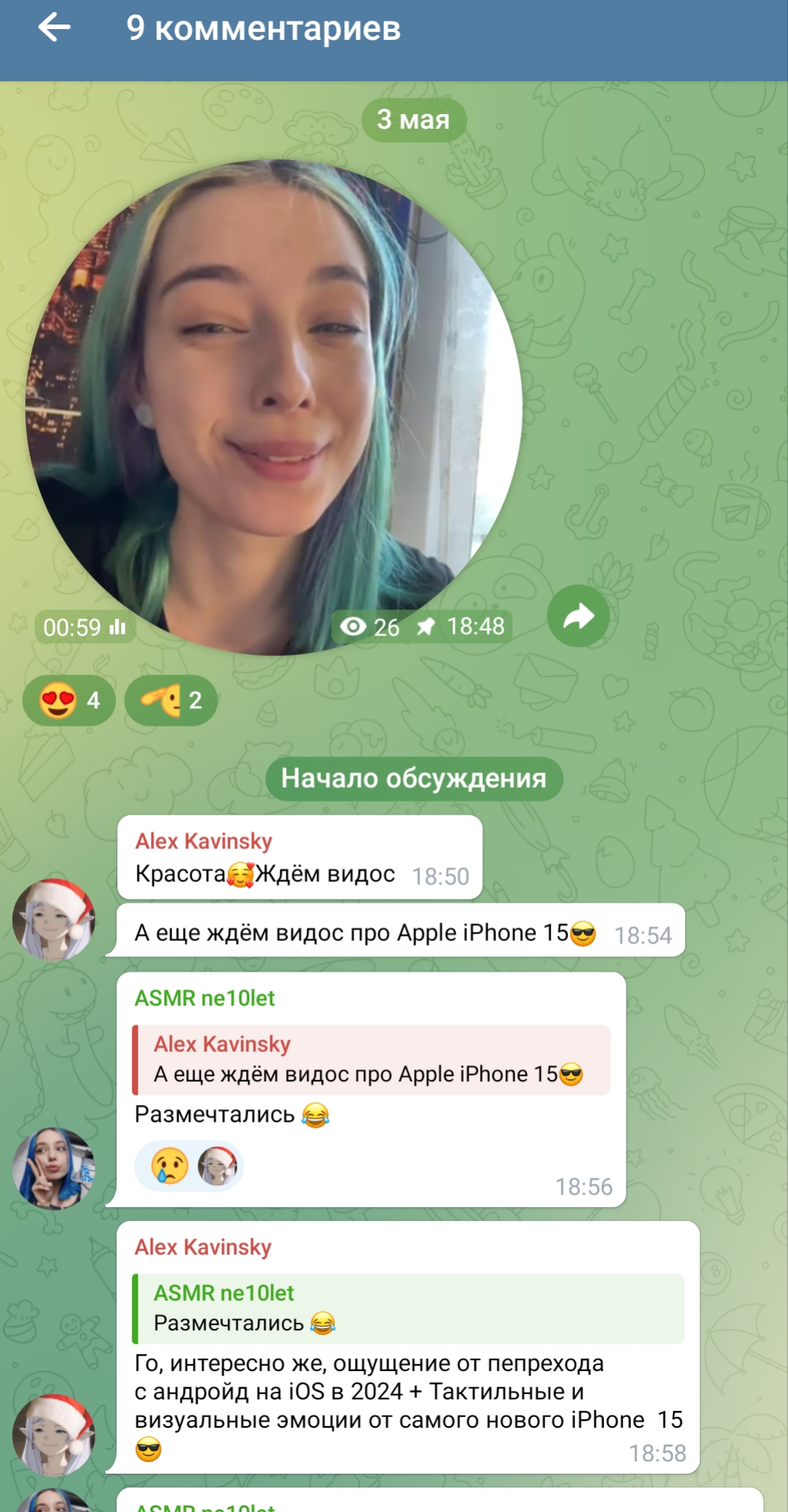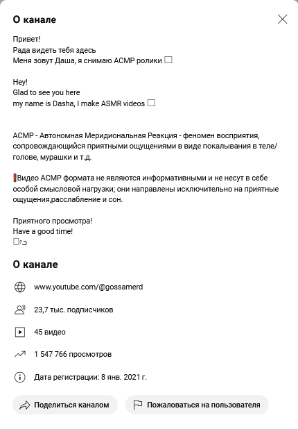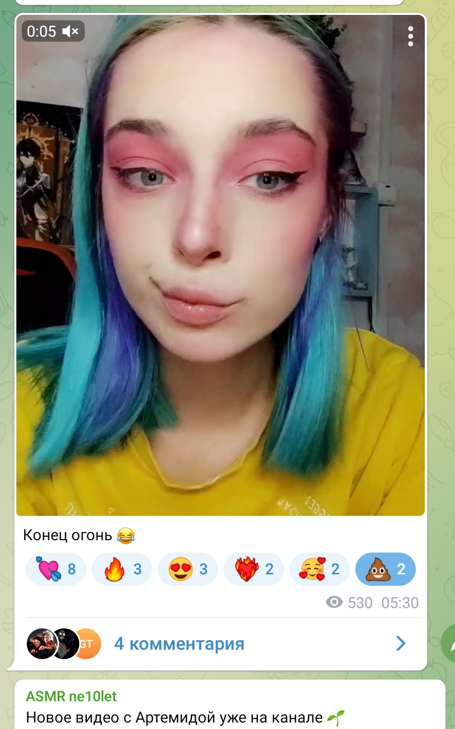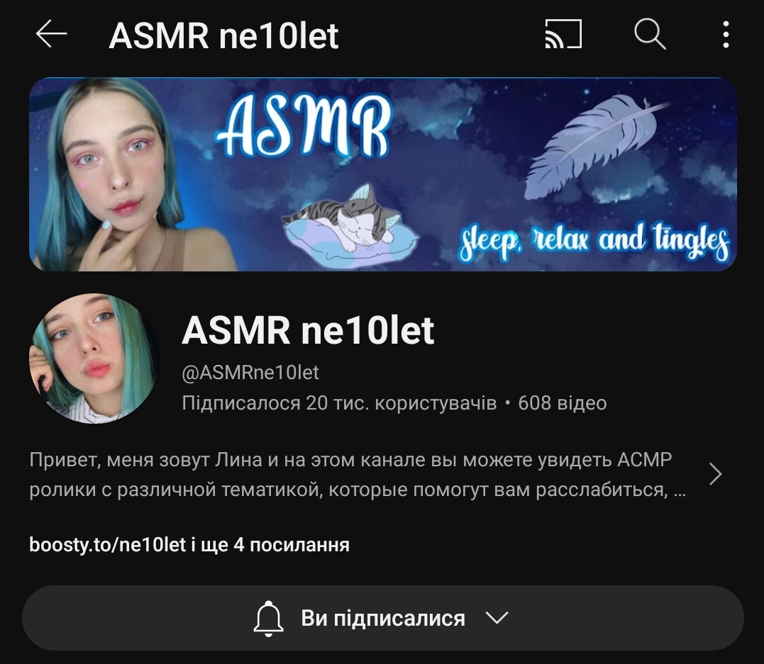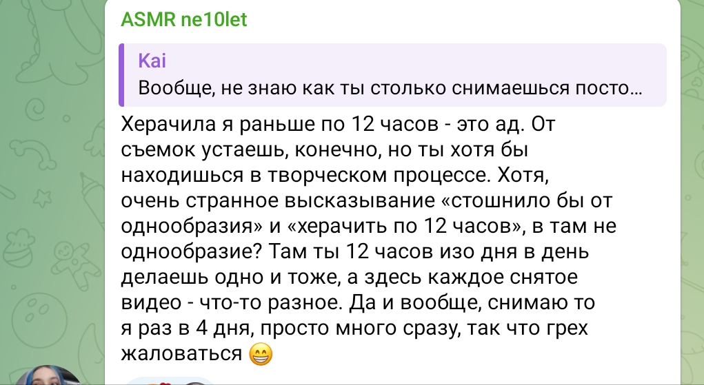 ну модератор её который все сюда постит и во всех каналов асмр активно участвует, и у муны и у малины и у Киттиклав он везде просто постоянно и он постоянно из дома вещает, то есть он инвалид видимо...