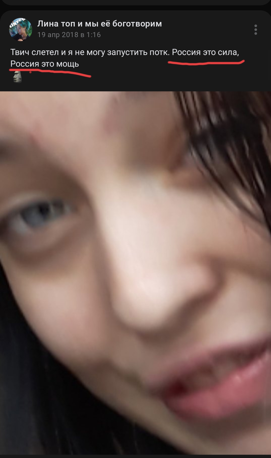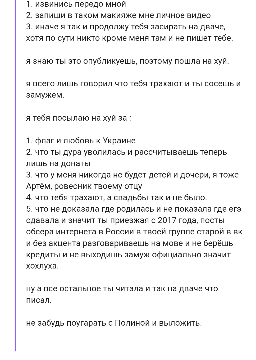 1. докажи что из России ты, паспорт егэ документы 2. объясни свою любовь к ихнему флагу и любви к мове в постах и на стримах 3. документы что больная шея и спина также а ещё ты часто говоришь что думаешь про суицид, в псих диспансер также сходи и документы покажи что адекватная и здоровая, пока я вижу лишь то что ты судя по глазам на чем то вечно сидишь под чеп то и бухаешь вечно а тебе ещё братьев доверяют, то есть в органы апеки могу заявить 4. почему нет фото видео с весны что делала в лесу по ночам, собирала кой чего? 5. почему у тебя они на их языке свободно общаются 6. удали фото с флагом и расскажи почему уволили с озона и нигде ра учишься не работаешь.