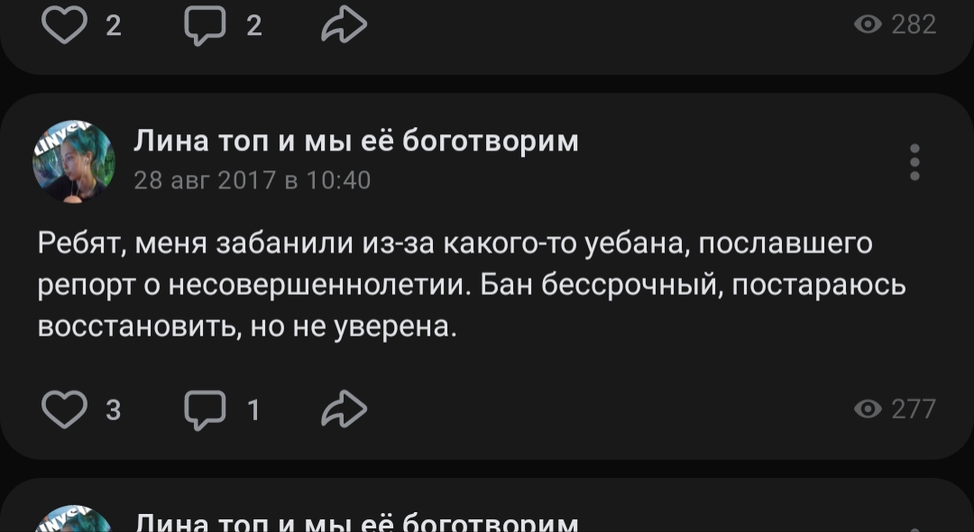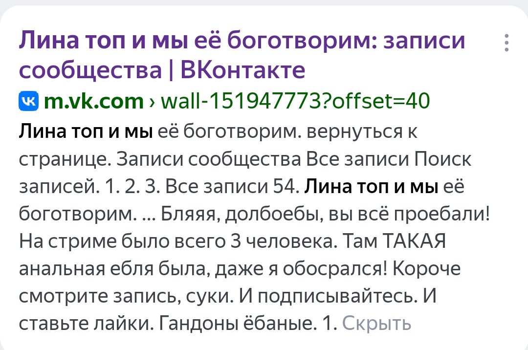 1. ДОКАЗАТЕЛЬСТВА СКРИНЫ ГДЕ Я ЛИНА. 2. ЗАЧЕМ ТЫ ПОДПСИЫАЕШЬСЯ ЛИНОЙ У ТЕБЯ БИПОЛЯРКА ? МОЖНО ПРОСТО МОДЕР ЛИНЫ НАПРИМЕР ХОТЯ БЫ 3. СПАМ ЛИШЬ ОТ ТЕБЯ ИСХОДИТ 4. И ГДЕ ЖЕ ЕЩЁ А НЕ ТОЛКЬО НА ДВАЧЕ ?