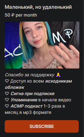 >>173488 >и кнопки ютуба НИКОГДА не будет у тебя. Уже 25к почти. Стабильный выпуск видео и стримы дают свои плоды, подписчики уже как снежный ком начинают расти. Кнопка вопрос времени. >и да. за донаты ты бы писала любые сигны мне для меня и записала бы это видео. Ты конечно "особенный", но правила заказа для всех одинаковы, сигны в рамках приличия, личное видео может быть ролевой без пошлостей или АСМР триггерами по желанию заказчика.