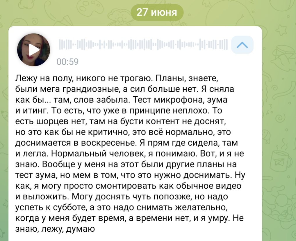 Только закончила съемки, и чтобы вы понимали мой послужной список: 🔅3 видео на ютуб (2 из которых оч сложные и пришлось снимать дополнительные звуки и кадры) 🔅6 шортсов 🔅4 персональных видео на бусти, 1 эксклюзивное, подкаст и сигны 🔅Видео в тг конечно же И при этом я не устала 😀 (обычно сдаюсь на половине) Так что земля мне пухом, пошла поем и буду монтировать чуть ли не половину из этого, потому что завтра отчаливаю в ночное на острова🏝️