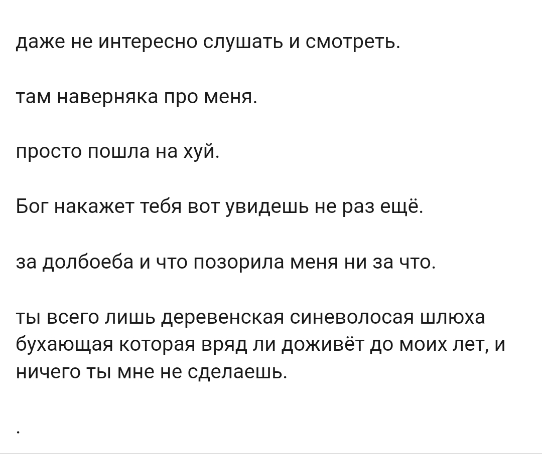 короче Анжелика ты нихуя не понимаешь меня. а я видимо не боюсь твоих унижений и оскорблений. все мои сообщения и прочее просто рофл и шутка, я ничего такого кардинально го и не писал а ты меня и в любовники свои записала и в фанаты и маньяки. ты же весёлая вечно девка и адекватная лишь дуру строишь образ такой твой для них . давай решать как то наш конфликт. если без судов никак. я только за.