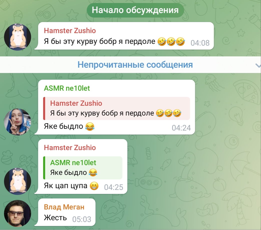 а ещё когда девушка шлюха с 14 лет и продаёт себя за пк, не имеет права оскорблять ничью мать и ты мне Сосала или мы что в отношениях были, какое твоё сраное дело что я одинок в 35, я 6оворд фактами, вижу флаг и мову говорю, про Таню асмр и что я то гей то педофил ты уж определись мать бля, я просто девственник как бы.