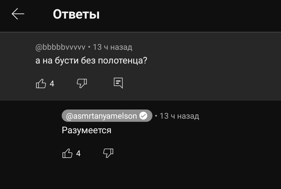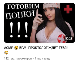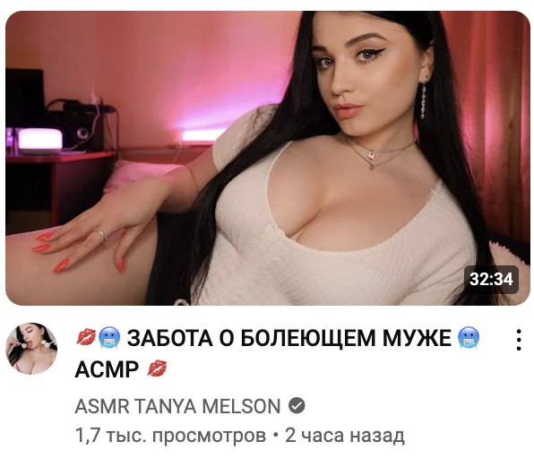 >>169888 я не тот, с кем ты перепалываешься, этим видосам не хватает обнажения. я не понимаю её она продаёт нюдсы, но при этом не хочет добавить в свои асмр видео немного пикантности