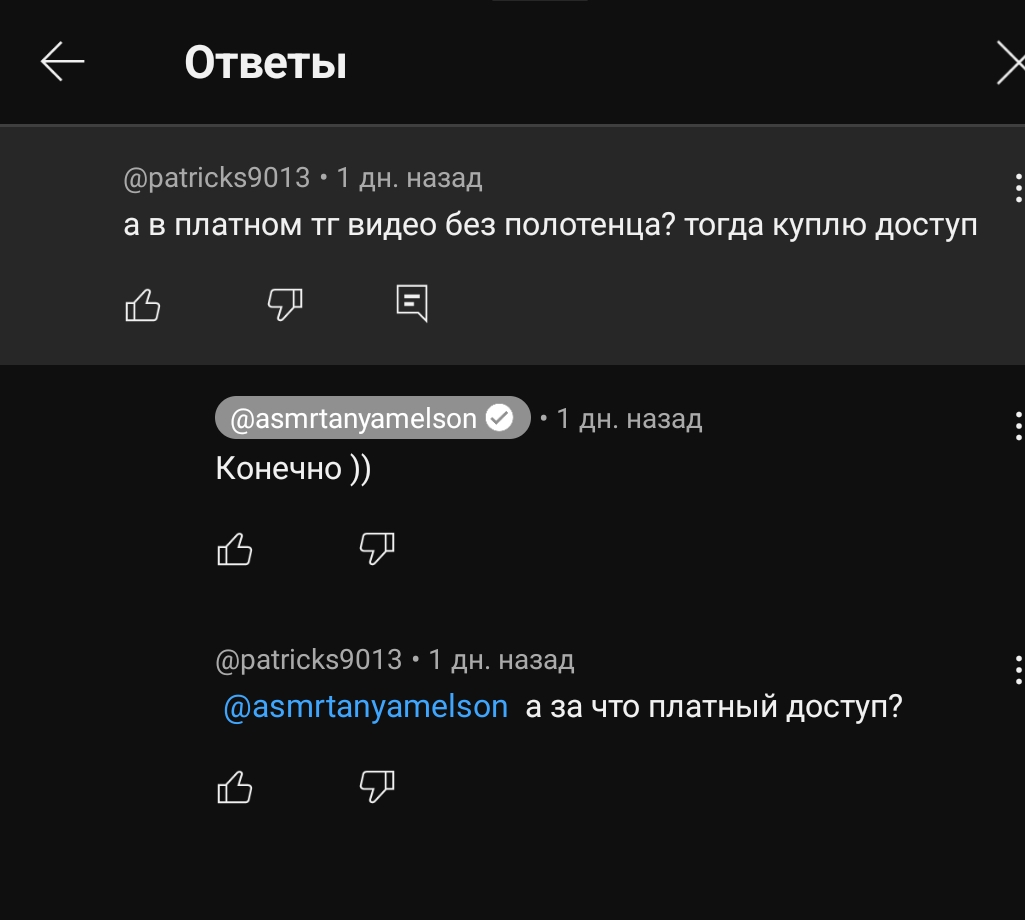 то же самое как у Ниши Артист, я ей предлагал бабки за рп с обнажёнкой, тем более что у неё и нюдсы и видосы короткие есть, для себя хотел заказать видос, но она сказал нет пока такое не делаю