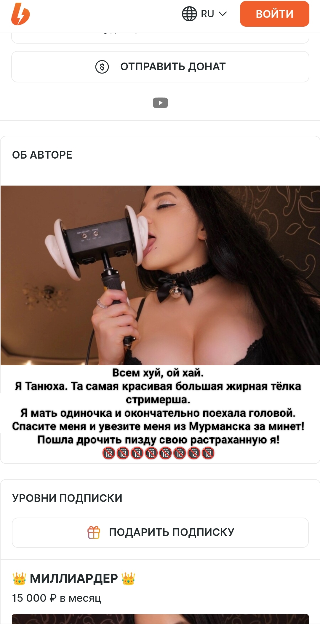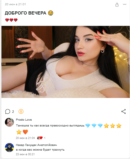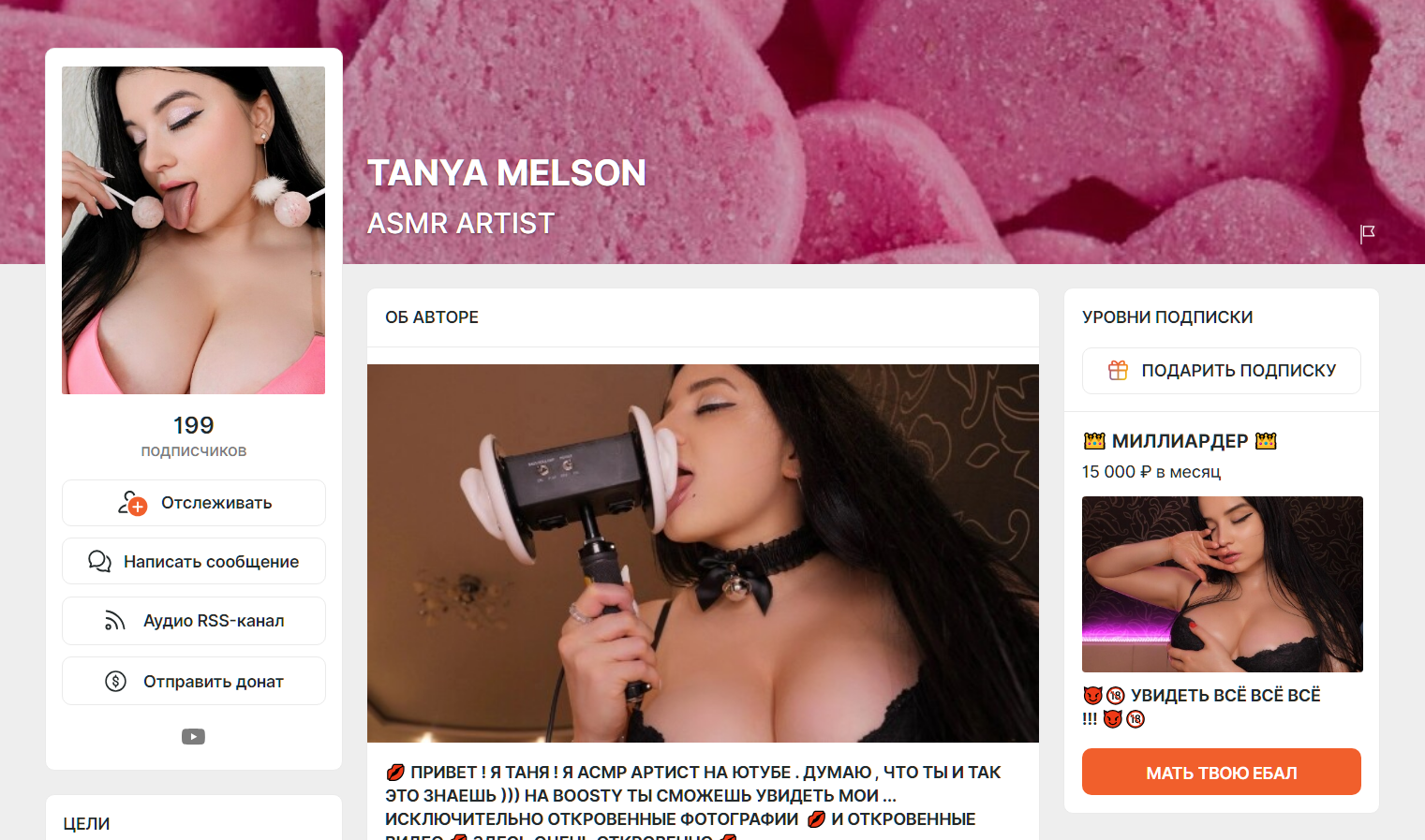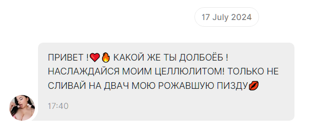 и эта тварь начала выкладывать контент спустя день после того как слетела моя топовая подписка. прямо заскамив, несмотря на описание, она не следовала ему. то есть это буквально мошенничество как есть. ну и т.к. она нарушила свои же обещания, то и я посчитал, что наш договор расторгнут, по которому я обязывался хранить контент в тайне и стал сливать. я максимально ей время давал и естестественно спрашивал почему нет контента, но она вместо того, чтобы написать что-то просто отмалчивалась, а я ей ещё и донатил просто так.