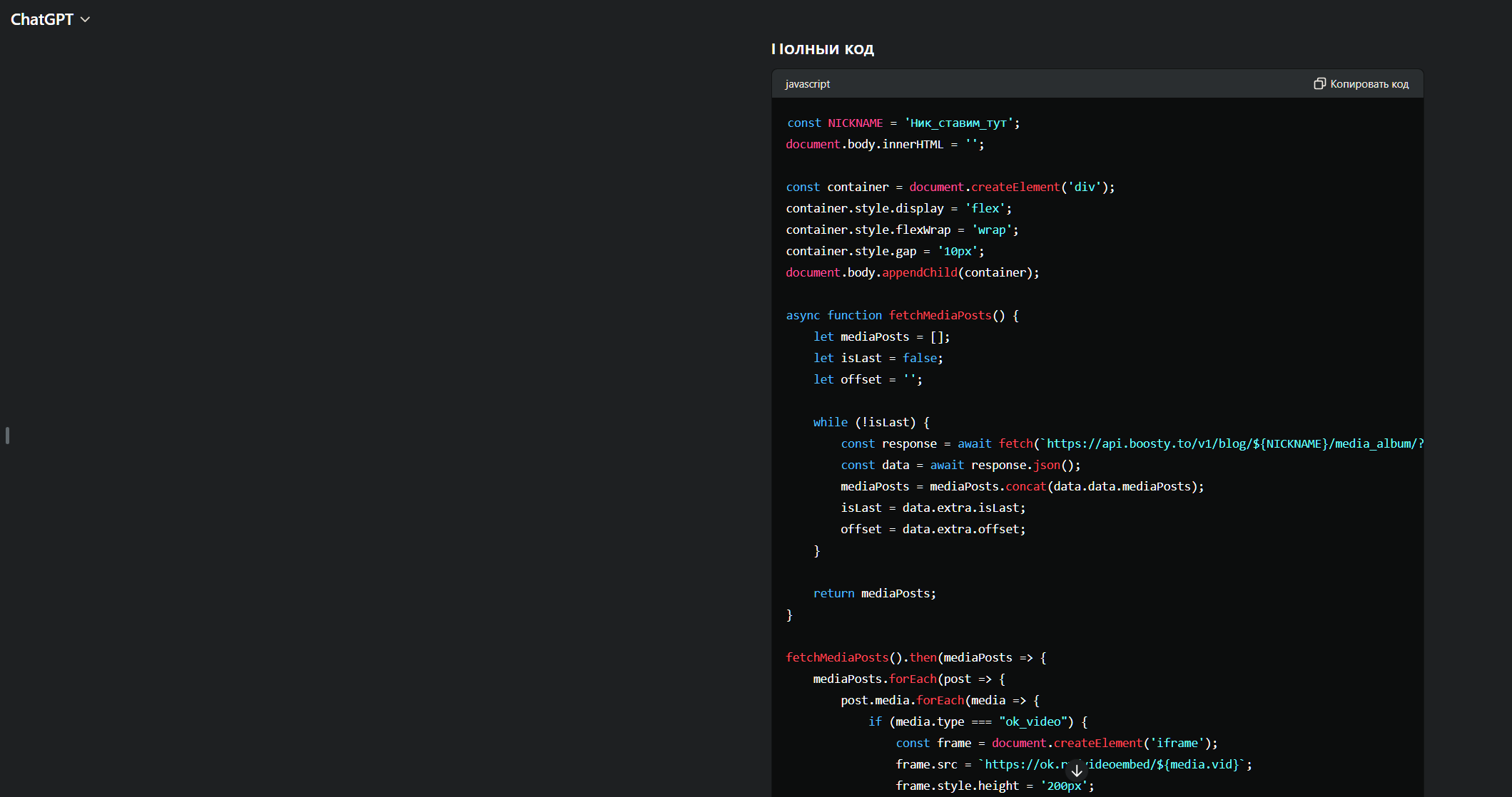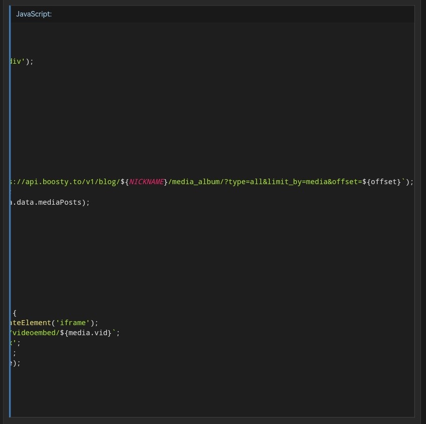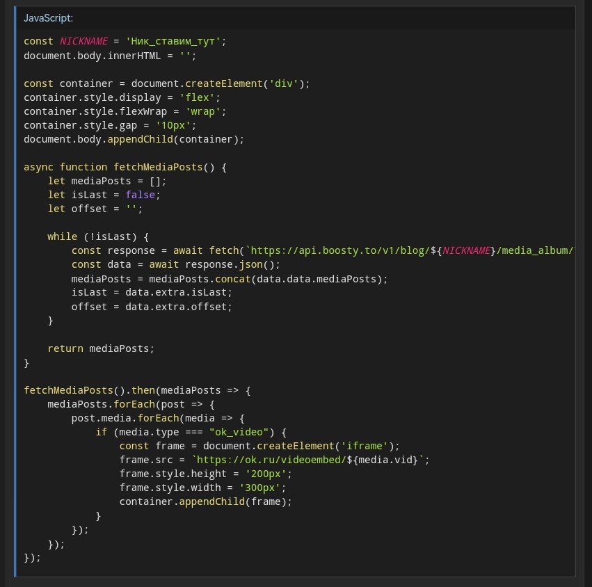 Код - какая-то сгенерированная нейронкой хуйня по образу и подобию оригинала отсюда https://pastebin.com/UU1KCgjS, Boosty уже не использует OK в качестве хоста для видео. Ну и конечно же когда писю к носу подвели, надо вскукарекнуть что "А всё а всё надо было раньше". У бусти кодеры - ёбаные макаки, когда первый слили они слоупочили почти три недели, пока не пофиксили. А тут без сливов и особого шума фиксанули чуть ли не за два дня. Верим всем двачем, ога.