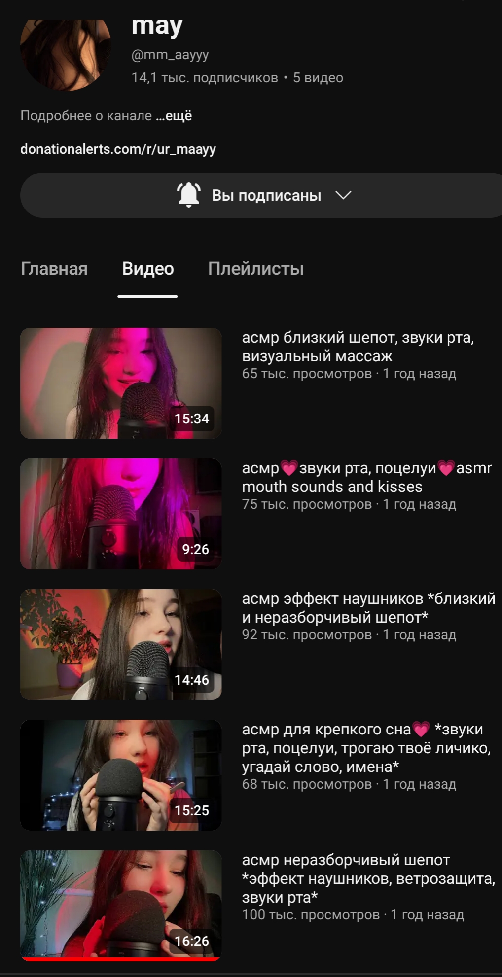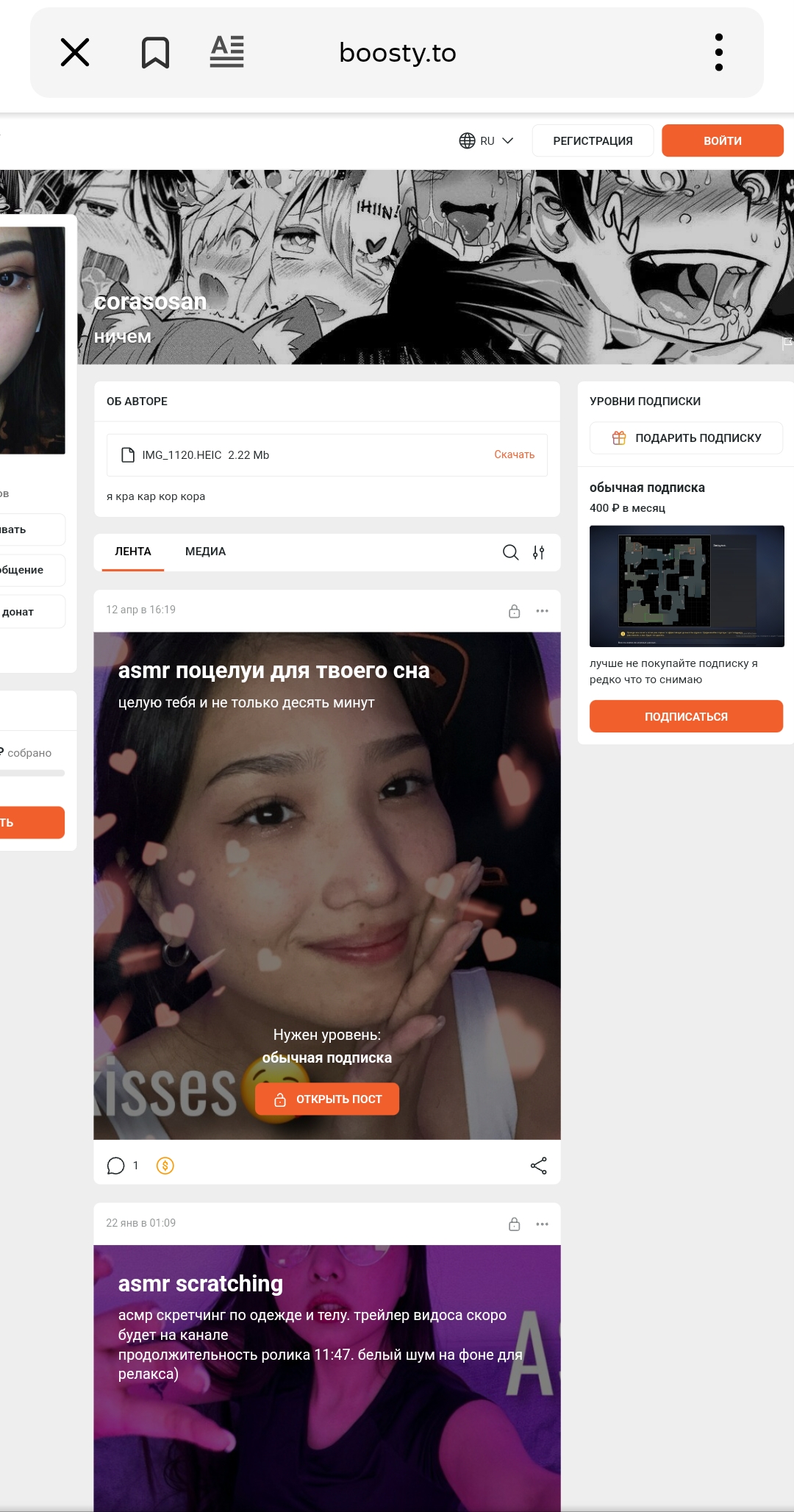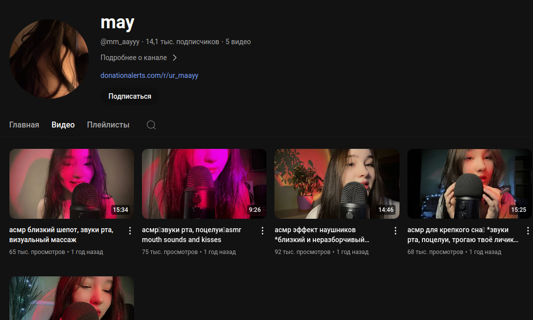 вроде банальный канал очередной асмр девочки, но недавно у неё появилась всё та же, банальная, очередная приватка именуемая как бусти, контент там вполне смотрибельный(до этого она хотела открыть приват в тг и постить там своё тело, но из личной переписки я узнал что парень её немного против этого, но сейчас имеем что имеем)