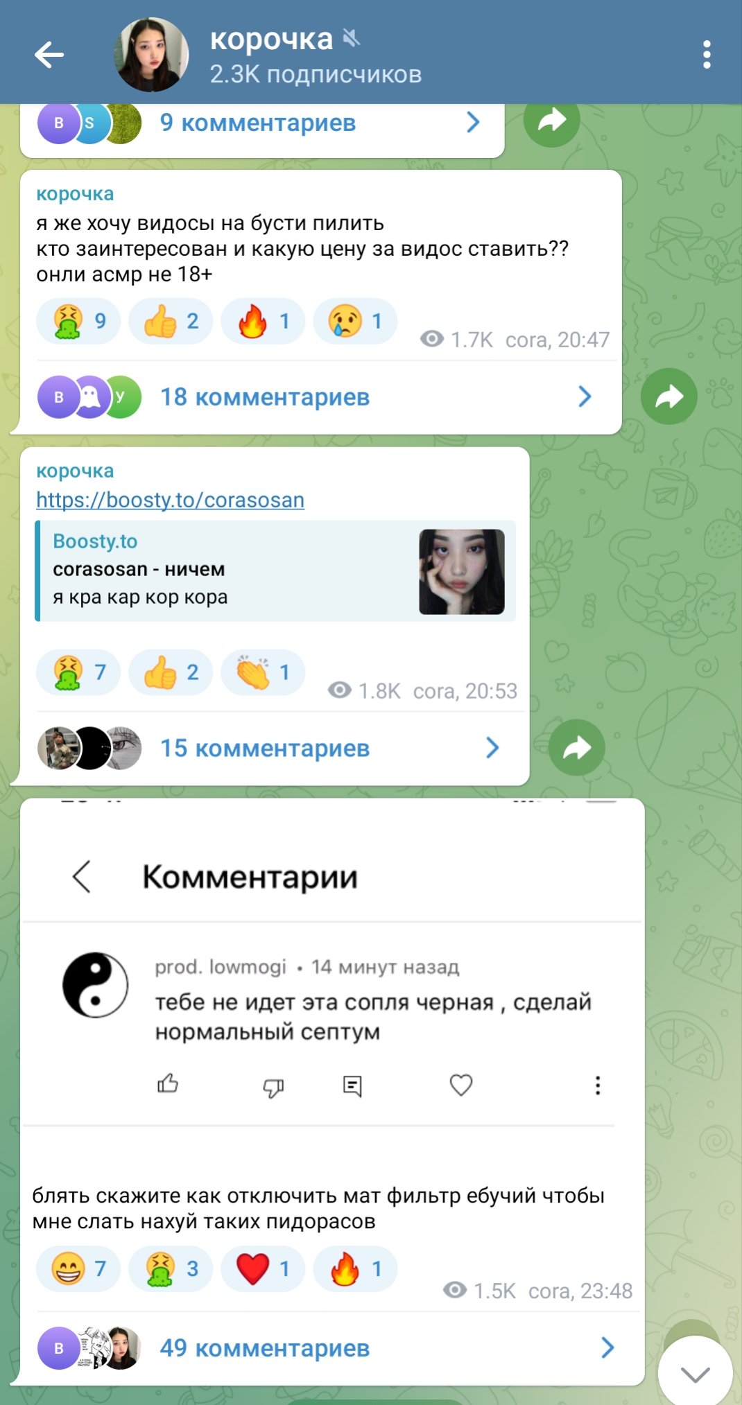 но то что закрывла коммены везде везде всё удалила и на уст ии на ютубе но продолжает бусти значит бросил муж все же а значит можно делать погорячее контент и цены поднять рах покупают.