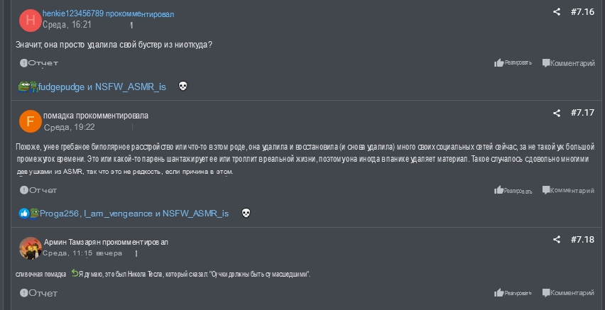 замужняя девка делает вид что ей интересен асмр -> сделала аборт, поехала крыша, биполярка -> завела бусти и начала голые сиськи фоткать но без лица ибо папка мамка узнают -> на иностранных форумах всё слили -> она психанула в очередной раз, месяки, муж бросил и молча всё удалила насрав на всех на бустеров и аудиторию -> но во всём виноваты двачеры