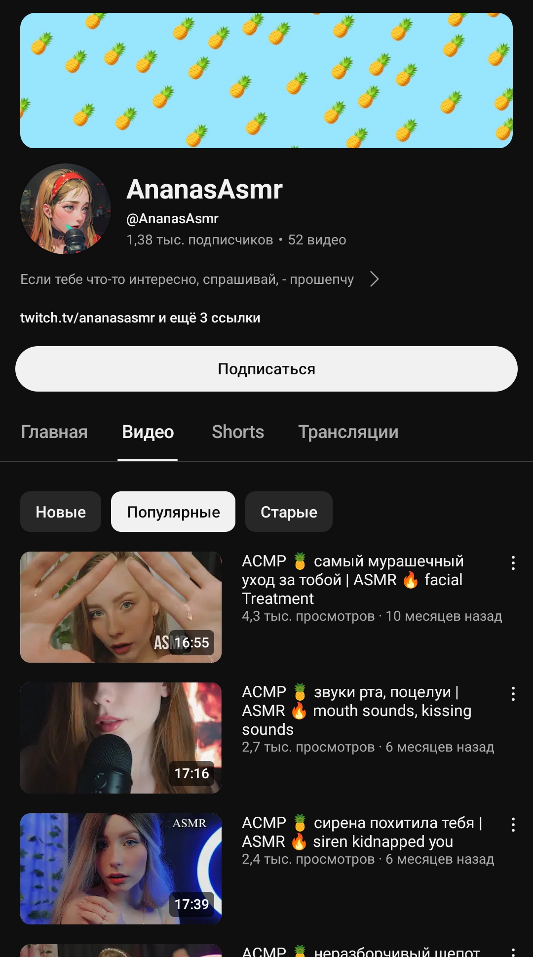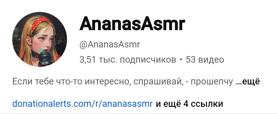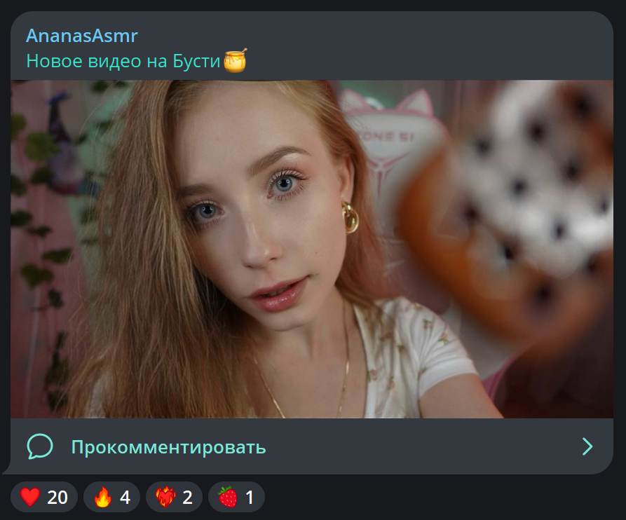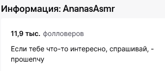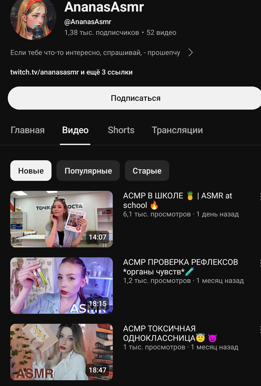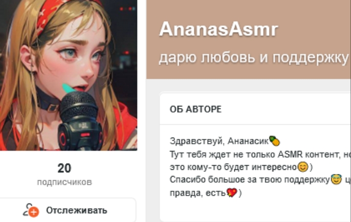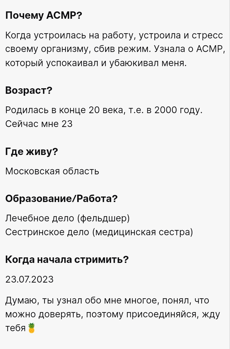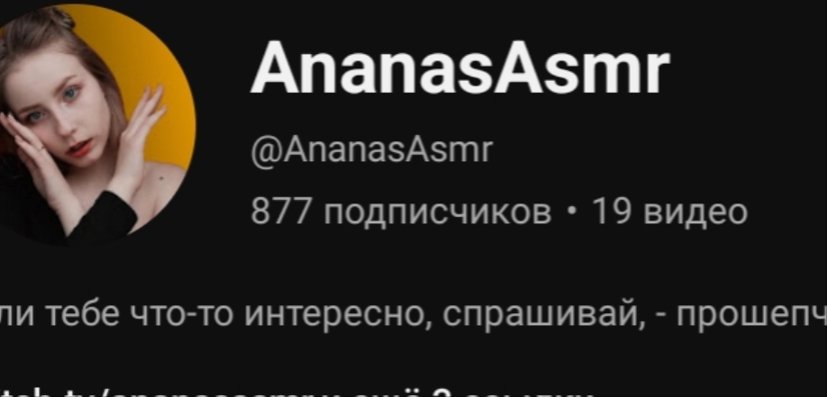 Смотрите какую ламповую няшу я вам нашёл. Тянка делает збс, видосов немного но всё что есть - всё годнота. Из интересного: • Имеет диплом фельдшера, отработала полгода за 20к в месяц и ливнула в АСМР • На стримах система заказов тригеров за твич поинты, по сути - бесплатно • Присутствует чувство юмора и отсутствие ЧСВ • Сигны уникальны и делаются не на отъебись Ссылки: • https://www.youtube.com/@AnanasAsmr - видео, их немного но они хороши • t.me/ananasasmr - телега с расписанием стримов и редкими фото • twitch.tv/ananasasmr - твич, стримы 5 раз в неделю по ~3 часа вечером • https://boosty.to/ananasasmr - фотки, судя по всему на него забили