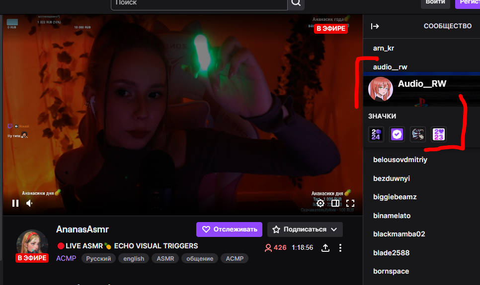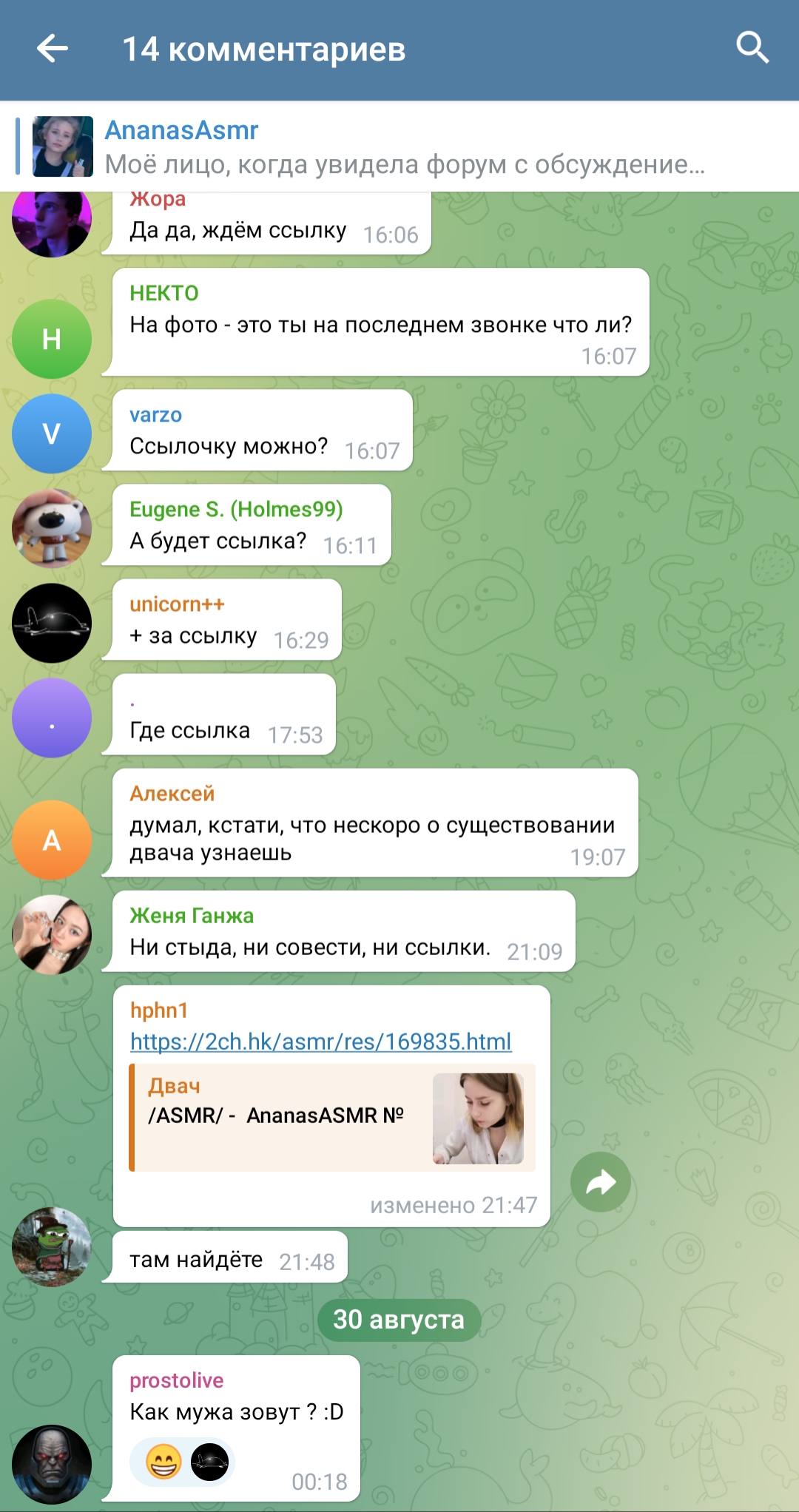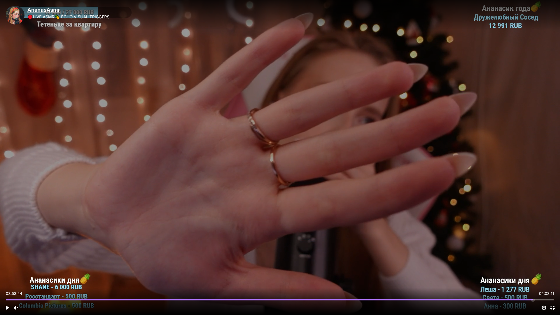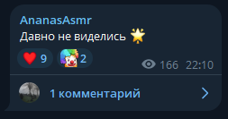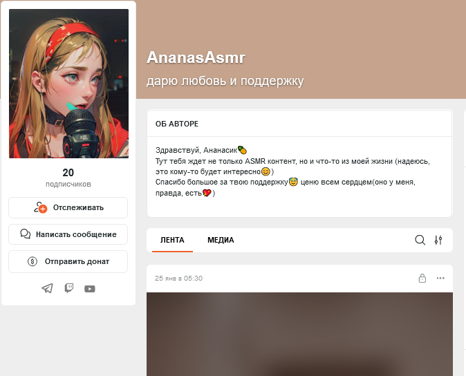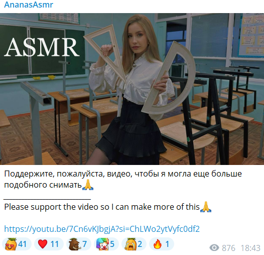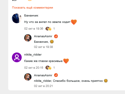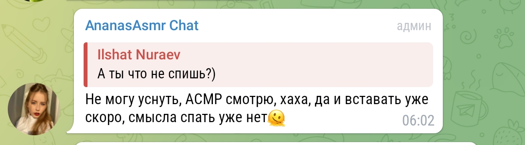 Смотрите какую ламповую няшу я вам нашёл. Тянка делает збс, видосов немного но всё что есть - всё годнота. Из интересного: • Имеет диплом фельдшера, отработала полгода за 20к в месяц и ливнула в АСМР • На стримах система заказов тригеров за твич поинты, по сути - бесплатно • Присутствует чувство юмора и отсутствие ЧСВ • Сигны уникальны и делаются не на отъебись Ссылки: • https://www.youtube.com/@AnanasAsmr - видео, их немного но они хороши • t.me/ananasasmr - телега с расписанием стримов и редкими фото • twitch.tv/ananasasmr - твич, стримы 5 раз в неделю по ~3 часа вечером • https://boosty.to/ananasasmr - фотки, судя по всему на него забили
