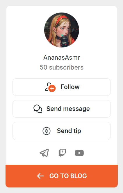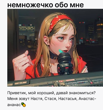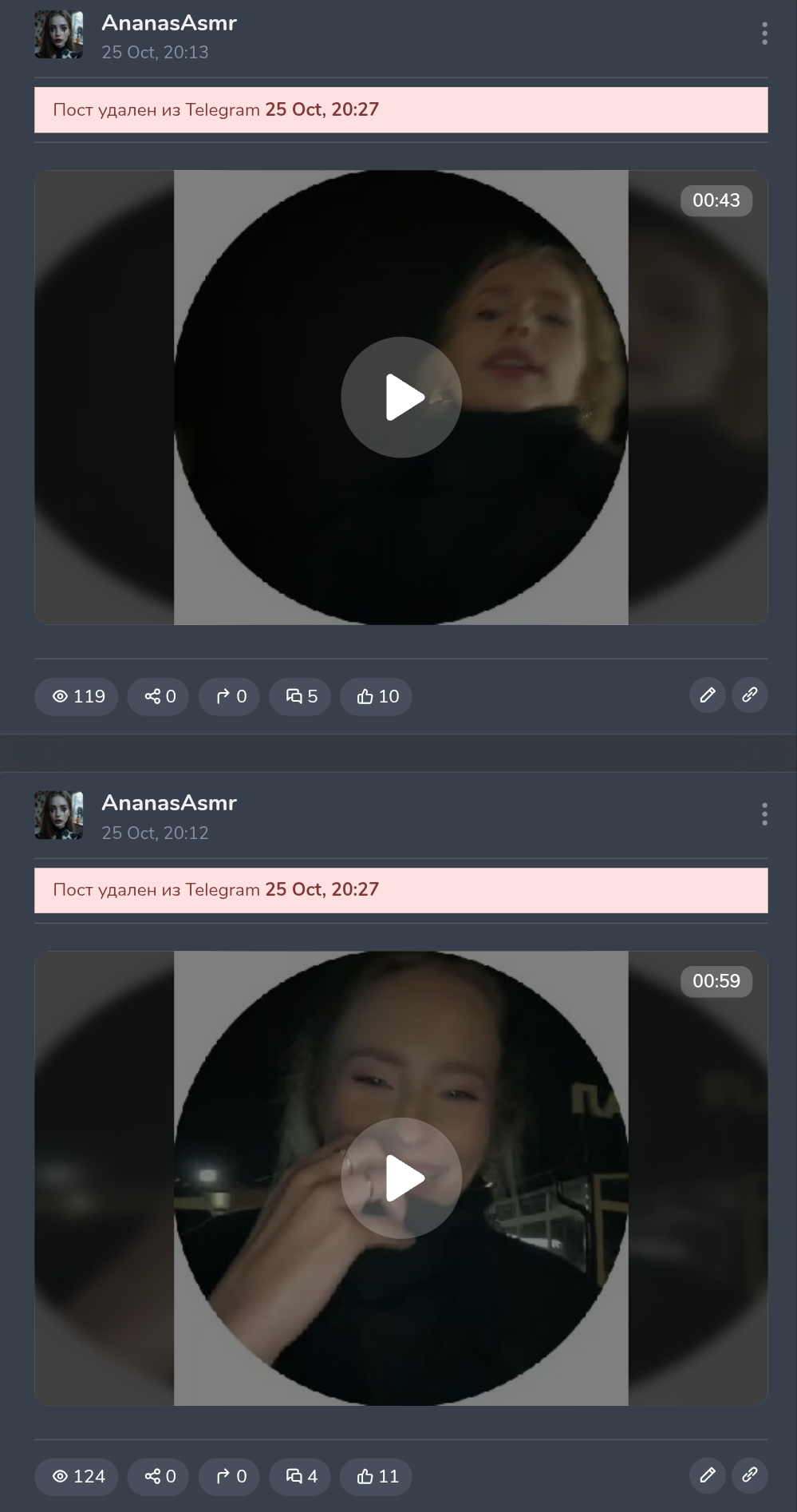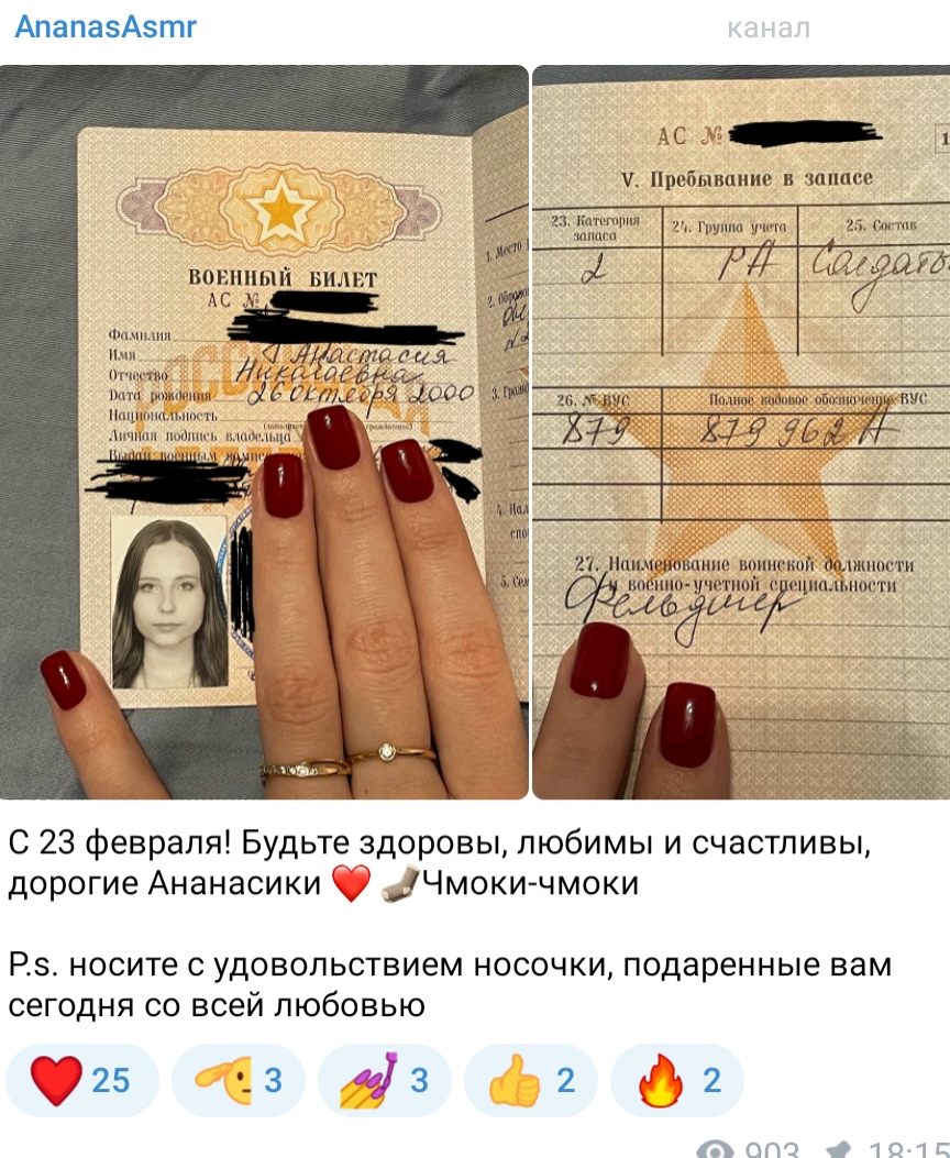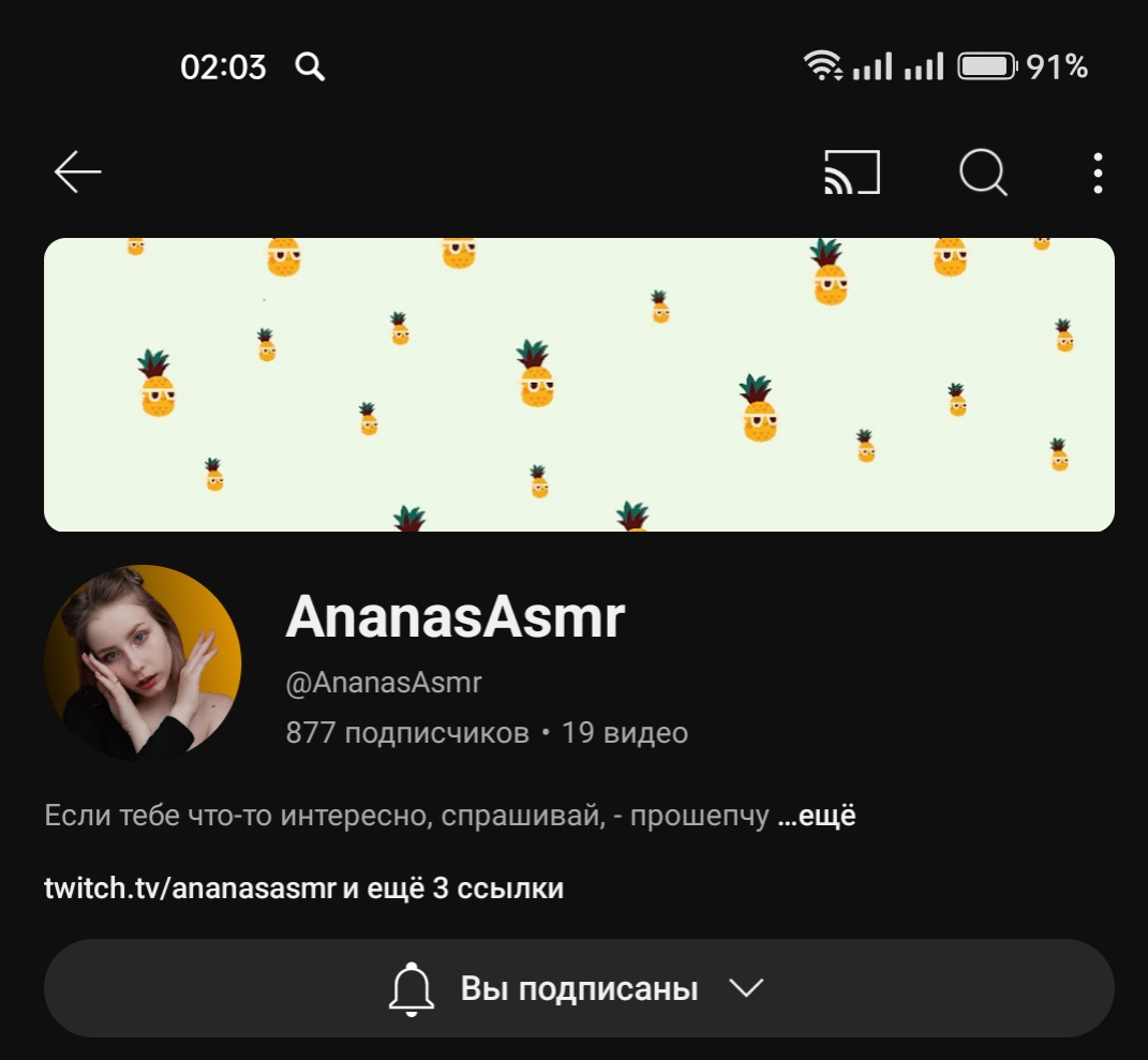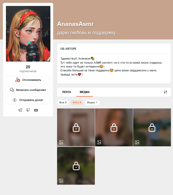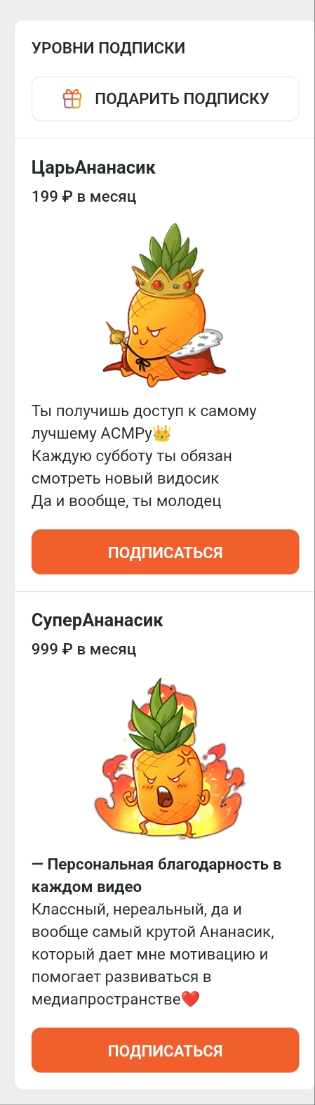 Смотрите какую ламповую няшу я вам нашёл. Тянка делает збс, видосов немного но всё что есть - всё годнота. Из интересного: • Имеет диплом фельдшера, отработала полгода за 20к в месяц и ливнула в АСМР • На стримах система заказов тригеров за твич поинты, по сути - бесплатно • Присутствует чувство юмора и отсутствие ЧСВ • Сигны уникальны и делаются не на отъебись Ссылки: • https://www.youtube.com/@AnanasAsmr - видео, их немного но они хороши • t.me/ananasasmr - телега с расписанием стримов и редкими фото • twitch.tv/ananasasmr - твич, стримы 5 раз в неделю по ~3 часа вечером • https://boosty.to/ananasasmr - фотки, судя по всему на него забили
