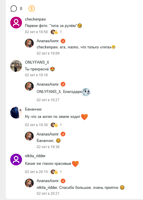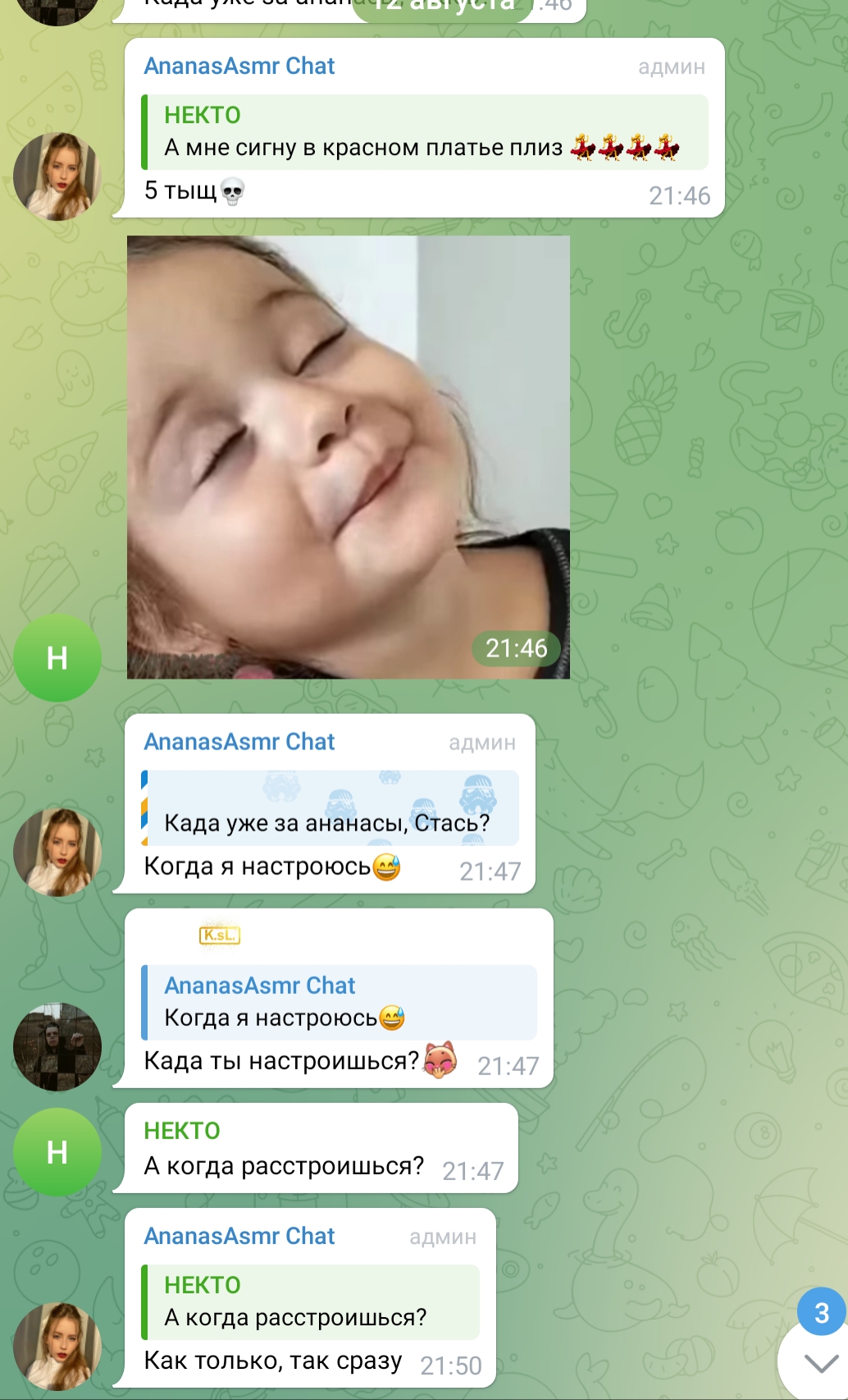 Оставлю лишь одно напутствие для симпов. Вам ничего не светит. Вы лишь одни из сотни денежных кошельков. Вам будет приятненько на какое-то время, но все равно вы не построите отношения глубже, чем случайные знакомые. Лучше найдите девушку, потратьте денег для близких, да просто шлюху снимите, за те же бабки она даст вам гораздо больше любви, внимания и тепла чем ананасовое притворство.