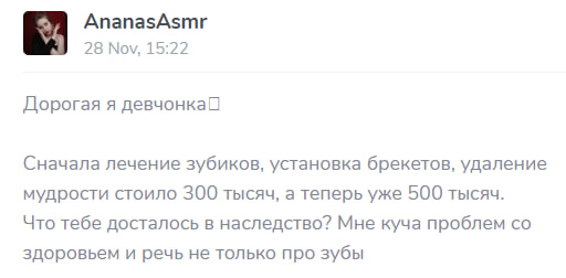 я говорю о том что она замужем и на хуй работать если такие донаты и всё это ечально, потому что девки номарльные в шлюх превращаются а стране врачи нужны. а не шлюхи. когда вырастете и вас хуево прооперируют вы вспомните мои слова эти. ну или не вспомните ибо сдохните на операионнос толе. изза того что настя в асмр пошла.