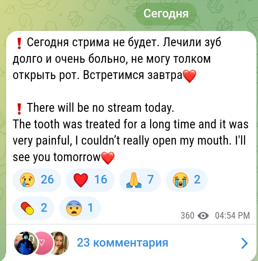 >ныть что болит зуб, но быть уверенной что завтра всё пройдёт Ананасик, я написала, что мне лечили зубик, и к завтрашнему дню точно пройдет (да и сейчас уже не болит). Ценю твою поддержку, и жду тебя завтра на стриме.
