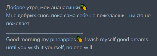 Но этой мой последний пост здесь, так и тянет выложить все, что на душе, но боязно. Желаю тебе всего-всего, ананасик. И в очередной раз благодарю, что продолжаешь следить за мной. Увидимся на стримах.
