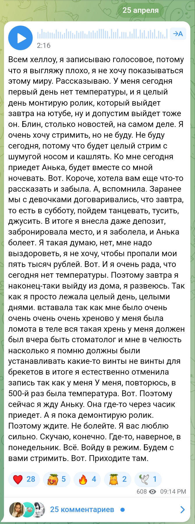 Поэтому решили с парнем сделать ну слишком явное расставание. 90% на это. Для 100% выводов надо смотреть ее стримы. Пока дописал, вообще пропало желание даже обсуждать ее. В пизду этот тред.