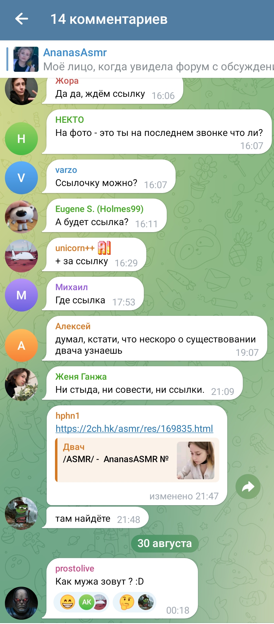 Бегом на стрим, анончики, сосочка наконец вышла замуж (иначе для чего делать перерыв). Но по-прежнему жаждет внимания от симпов https://www.twitch.tv/ananasasmr