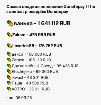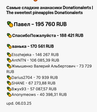 но это хорошо что ей меньше стали донатить. вернётся на работу. будет на пенсию копить. чуда не произошло. был ванька - так не дела и он исчез. что логично. я понимаю по касарю донаты. но пол сотни сотня пол ляма. это ненормально. она ничем не выдялется и не привнесла ничего нового. она в асмр - никто. еще и и врёт внаглую что одинока. её пороть ремнём надо ибо хуёвое воспитание а не донатить.