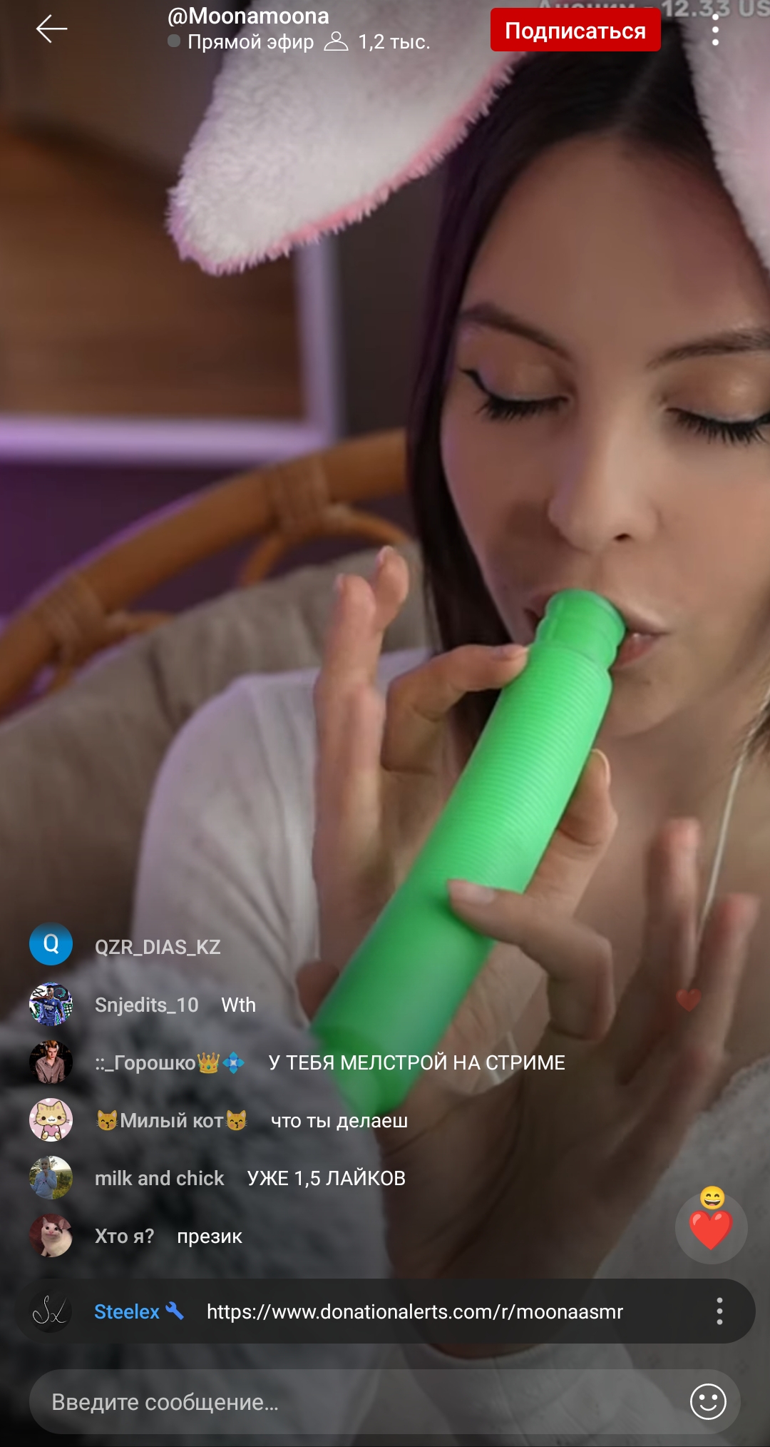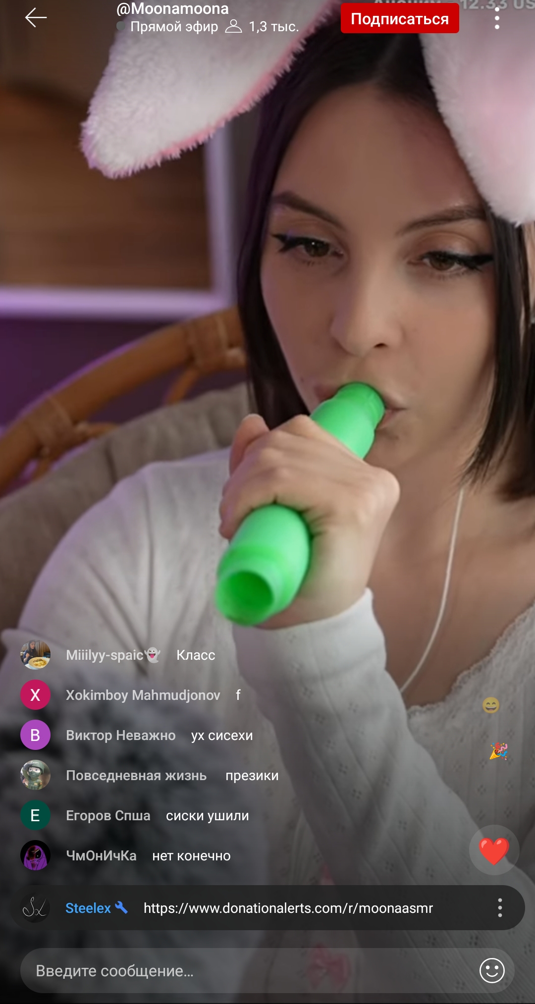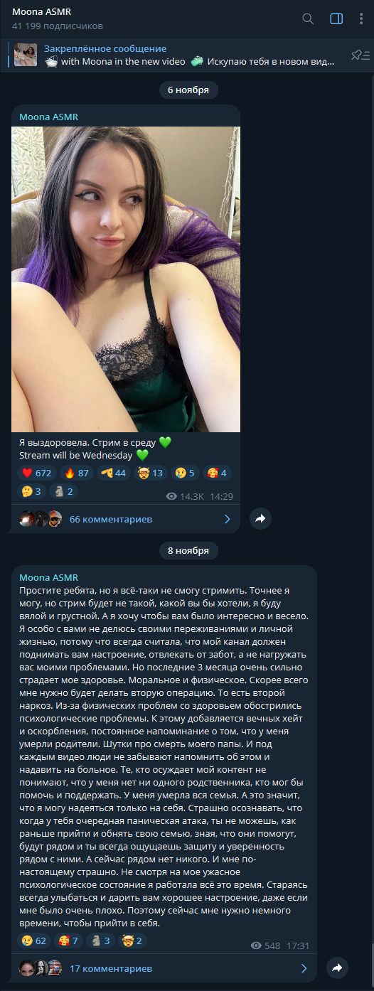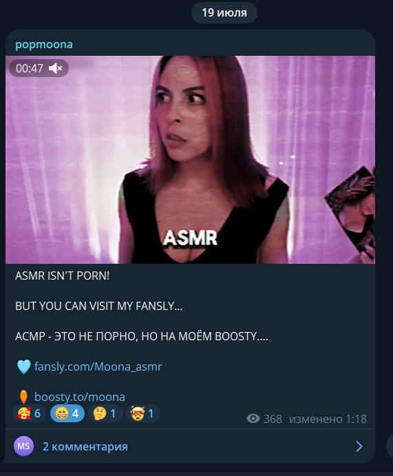 Смысл Муны и других асмр телок. Заводить публику, но не показывать сиськи письки. Пока платят деньги будет такой контент, когда все дружно перестанут лить лаве. Пойдет 2 этап либо "меня слили" или же начало с сисек и концовка дрочево дилдаком. Но как только это произойдет ее популярность упадет, поэтому она и не светит ничем а лишь заводит