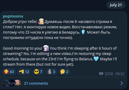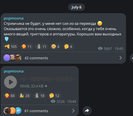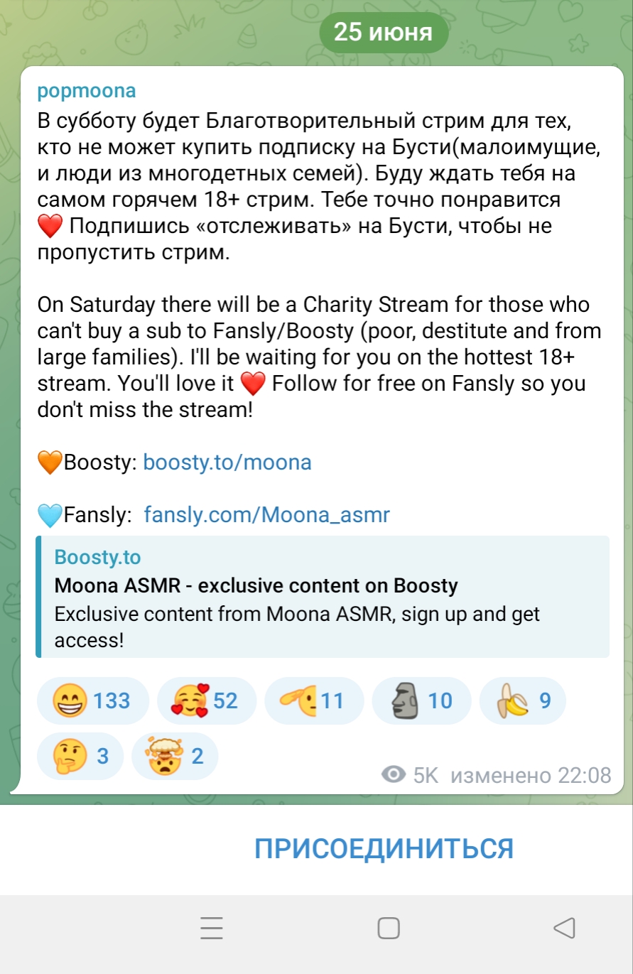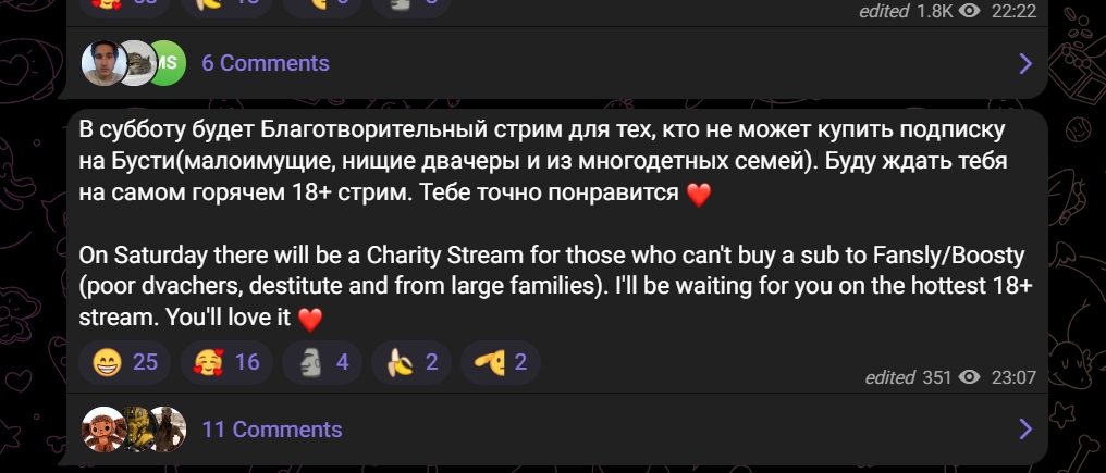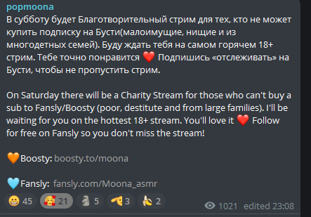это также подтверждает тот факт, что она спрашивала несколько раз проводить или нет стрим на бусти у БЕСПЛАТНИКОВ в своём тг, на бусти можно создать опрос, чтобы проголосовали бустеры, но ей плевать на них, она не ценит их поддержку