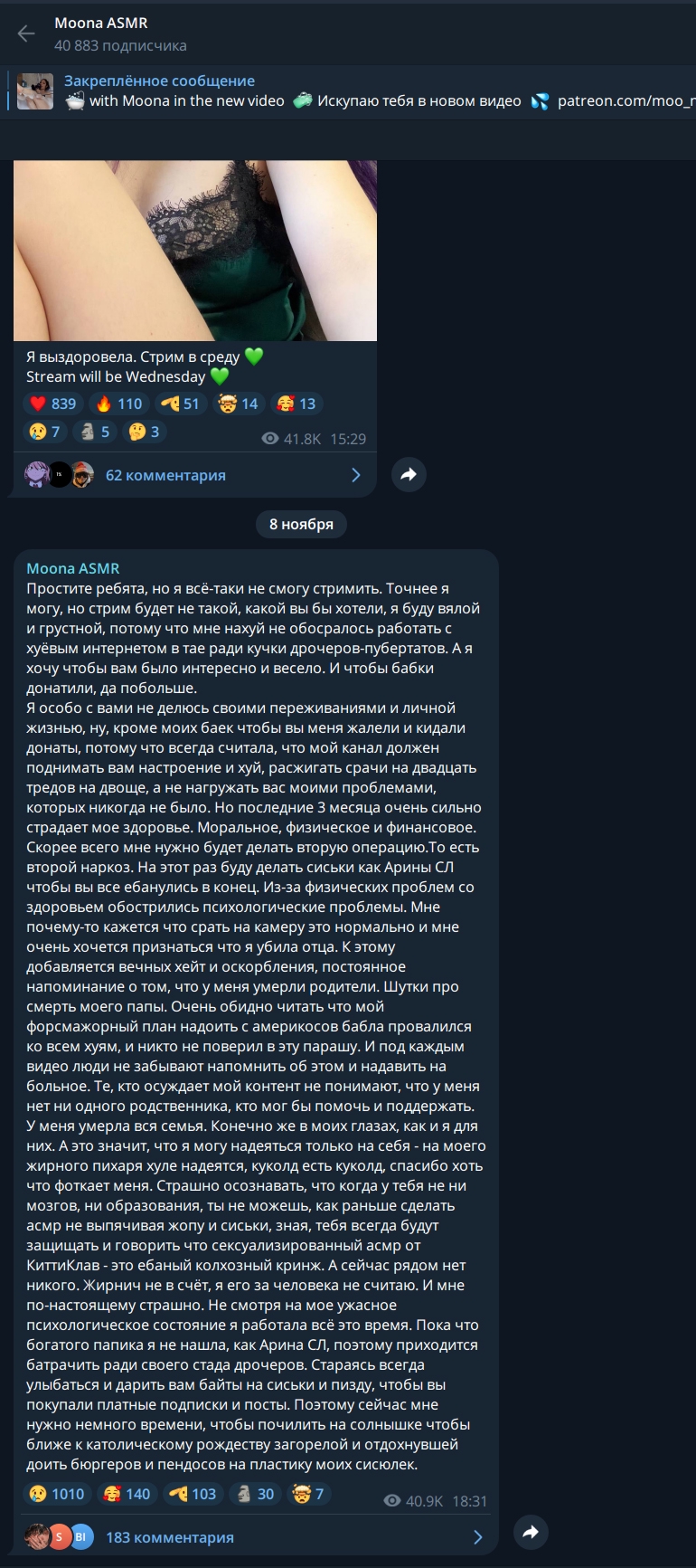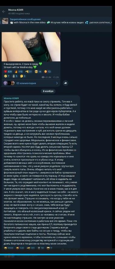 >>175647 Говоришь, что пиздит Муна. Но получается пиздишь ты. Где она говорила, что будет супер секси стрим в субботу. Она написала в тг, что приедет и будет стрим в субботу, где она расскажет, как провела время.Ни слово о бусти или фансли. Из-за того, что она устала в дороге, она перенесла этот стрим на воскресенье и сделала внеочередной стрим по своему желанию на Бусти, о чем сразу же сказала, что никакой сексуальности или чего-то ещё не будет, лампово посидела и пообщалась с фанатами. При этом не собирала подписки, не байтила(как обычно она делает). Она делала на платных стримах дофига вещей абсолютно бесплатно, не требуя донатов или чего-то ещё, тогда как те же западные стримерши и другие не пошевелят и пальцем, пока ты не заплатишь. Это также обсуждалось на иностранном форуме. Главная ценность Муны это искренние эмоции, где она не выжимает каждую копейку за микро-показ груди. Многие вещи она делает рандомно по настроению и бесплатно. Ты не замечаешь ничего хорошего, один негатив. Судя по твоему сообщению ты не был на неё подписан в момент вчерашнего стрима, а значит смотрел слив, так какого хуя ты имеешь право выебываться? Вот если бы ты был подписан и тебя бы что-то не устроило, то это был бы другой вопрос. А так ты посмотрел её контент, тебе не понравилось и ты отписался и пошёл смотреть контент других тянок. Но проблема в том, что такого контента из ру асмртисток не делает никто и это правда.