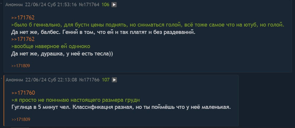 >>173376 >Ей эти миллионы на ютубе, уже как 2 года нах не упёрлись. Сама лично тебе сказала? У нее всегда было ЧСВ, вон интервью почитай. Наверняка вспоминает времена когда простейшие видосы собирали миллионы. По словам Ангелины Лин, главное достижение последних трех лет — появление ASMR-стримов. «Их мода и популярность в России — моя заслуга. >Кому? 1,5 анонам с двача? Ее подписоте. При овер 2 миллионов подписоты просмотры просто слезы. >она больше ляма собрала Как деньги ебаната оправдывают то, что стримы давно стали уг? >>173373 >В таком случае придирка неуместна Я и не придирался. Я написал, что это перестало работать.