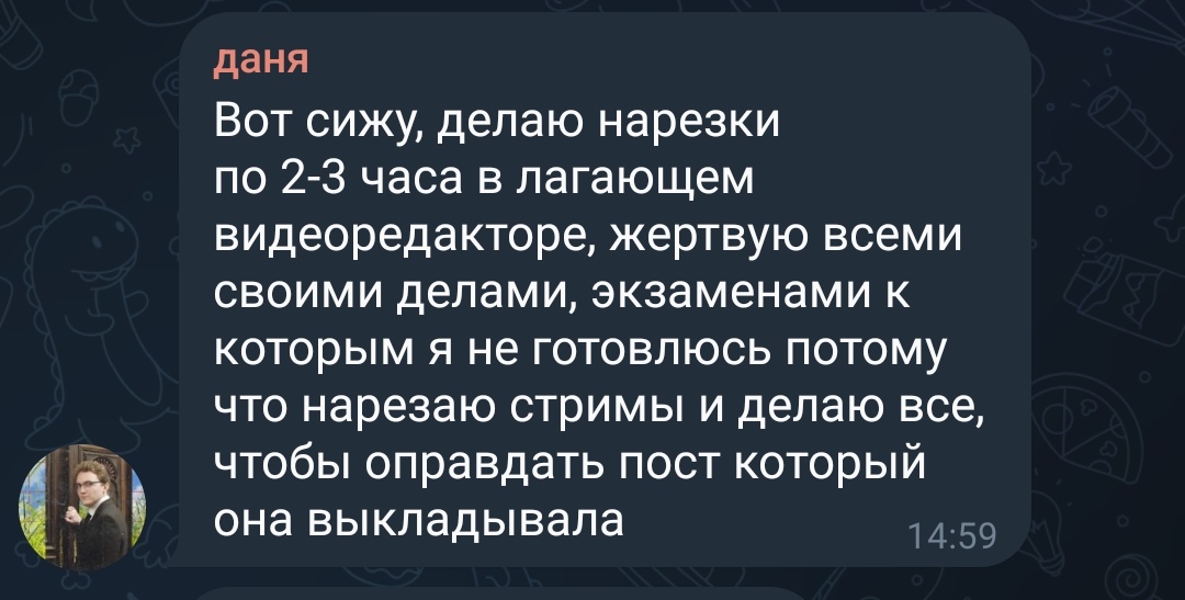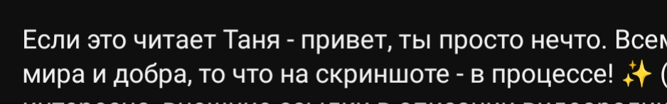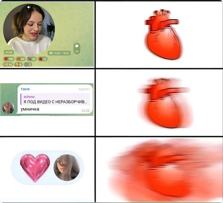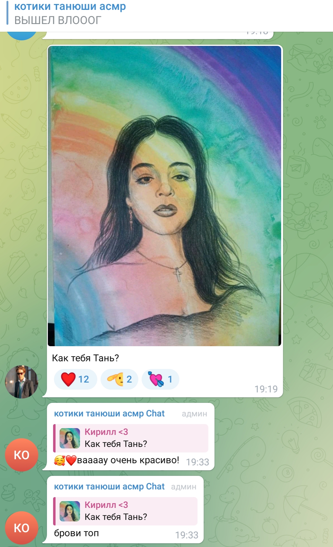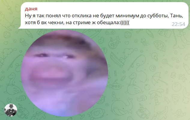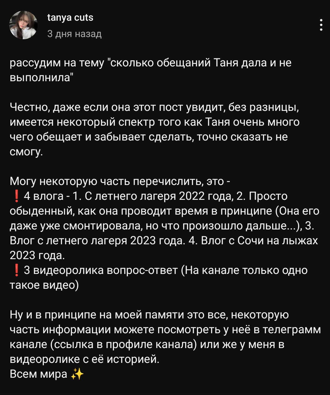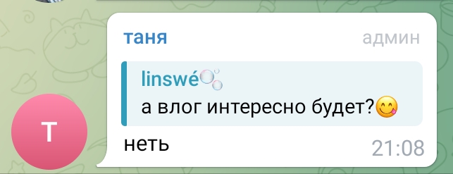 но надо отдать ей должное, я ей писал, выкладывай просто как завтракаешь или абсолютную хуету, и все равно все это будут смотреть, уже было бы 500к на канале, нет вместо этого она просто постит что-то в телеграм и дала добро на создание левых каналов о себе, и вопрос даниилу, а если тебе задонатят, ты какую-то комиссию вернёшь Тане? где та граница любви и уважения и бизнеса) вам пора составить контракт уже, 1к подписоты на его канале уже. Таня научи его вести канал, ты же опытная, рекламу раньше покупала, и сейчас рекламу тебе заказывают, предоставь ему свой райдер прайс лист. чтоб булки не расслаблял.