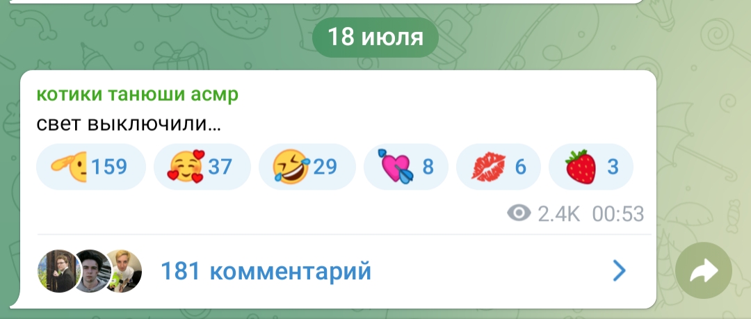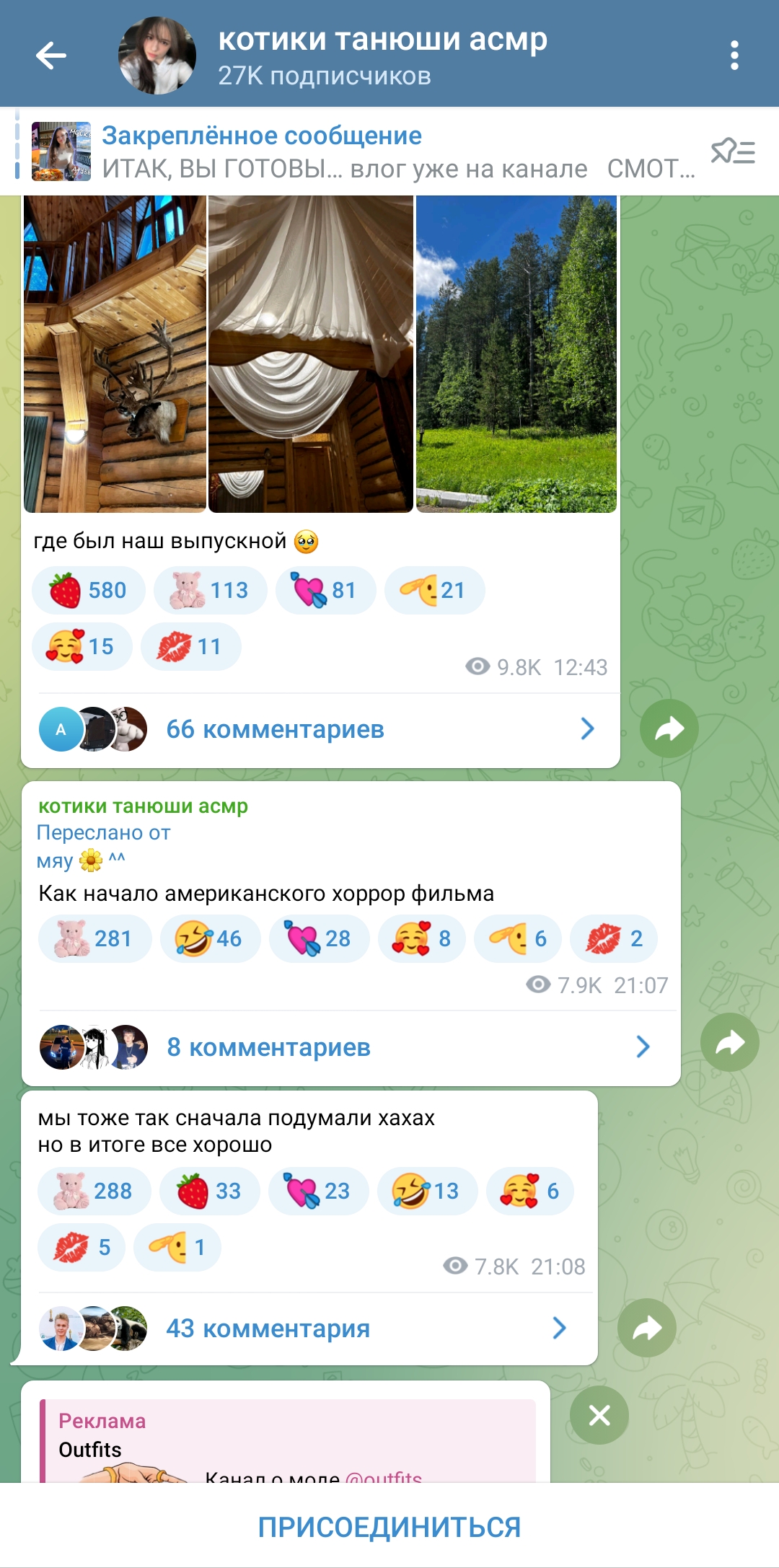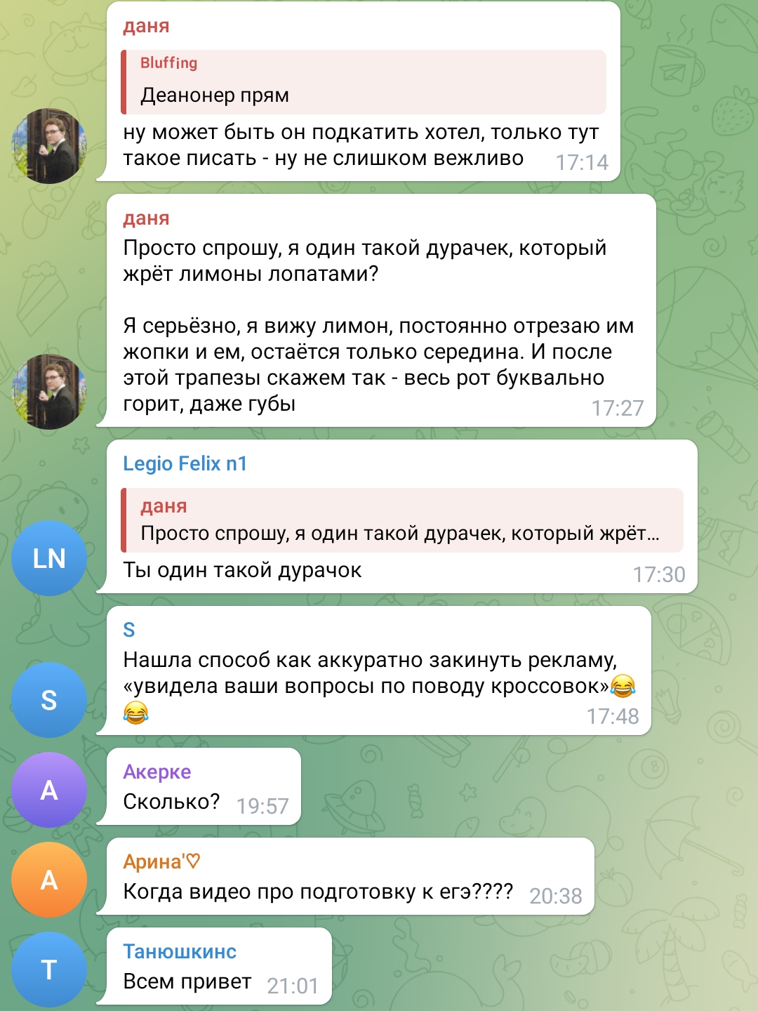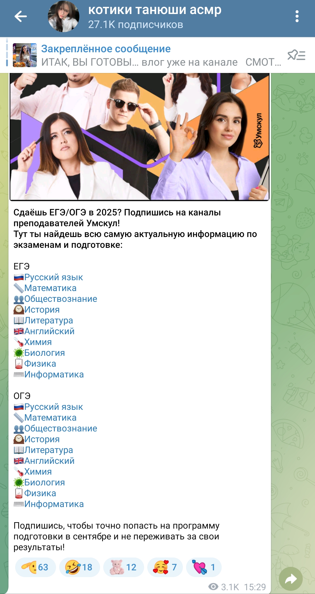 но надо отдать ей должное, я ей писал, выкладывай просто как завтракаешь или абсолютную хуету, и все равно все это будут смотреть, уже было бы 500к на канале, нет вместо этого она просто постит что-то в телеграм и дала добро на создание левых каналов о себе, и вопрос даниилу, а если тебе задонатят, ты какую-то комиссию вернёшь Тане? где та граница любви и уважения и бизнеса) вам пора составить контракт уже, 1к подписоты на его канале уже. Таня научи его вести канал, ты же опытная, рекламу раньше покупала, и сейчас рекламу тебе заказывают, предоставь ему свой райдер прайс лист. чтоб булки не расслаблял.