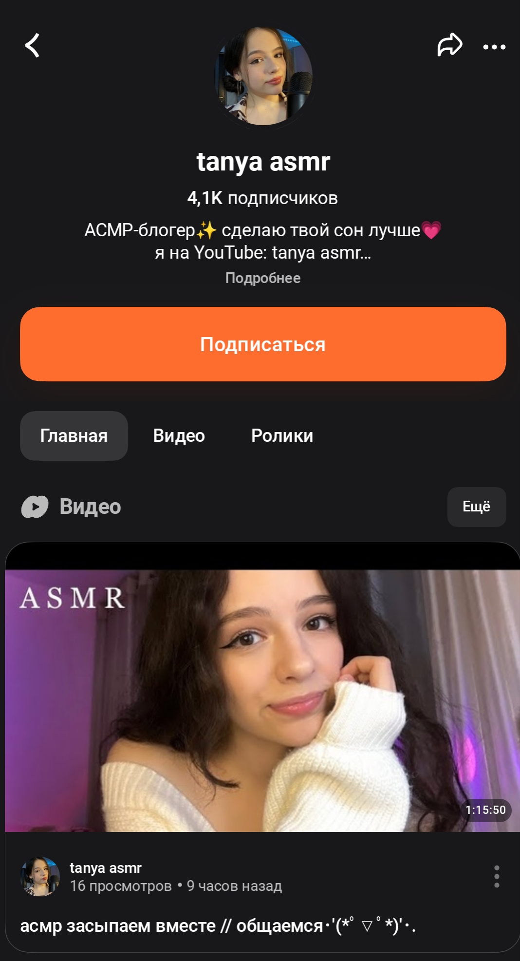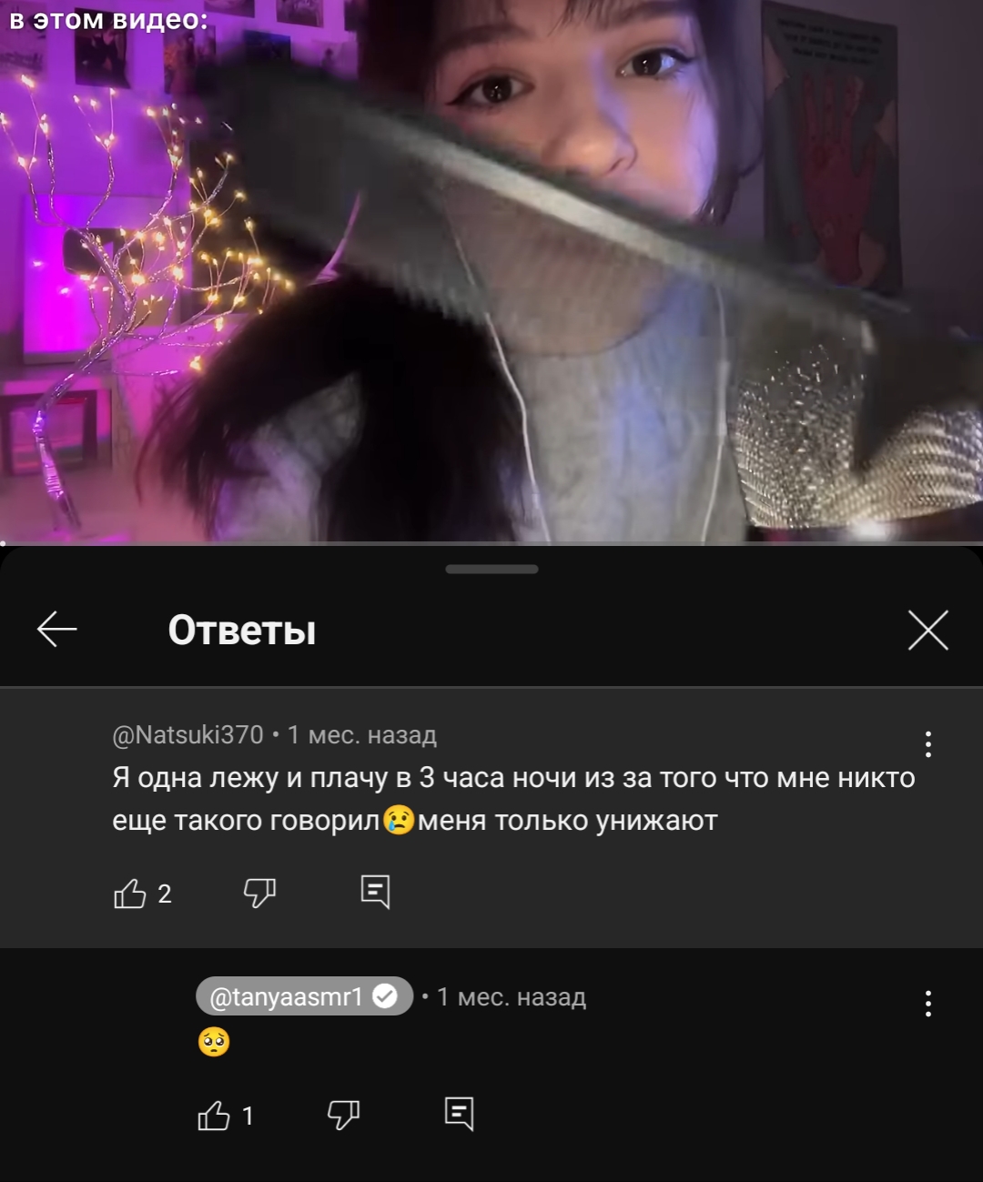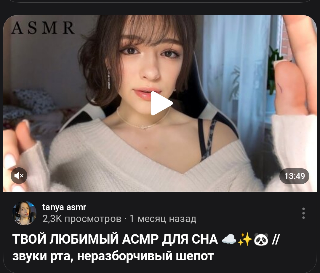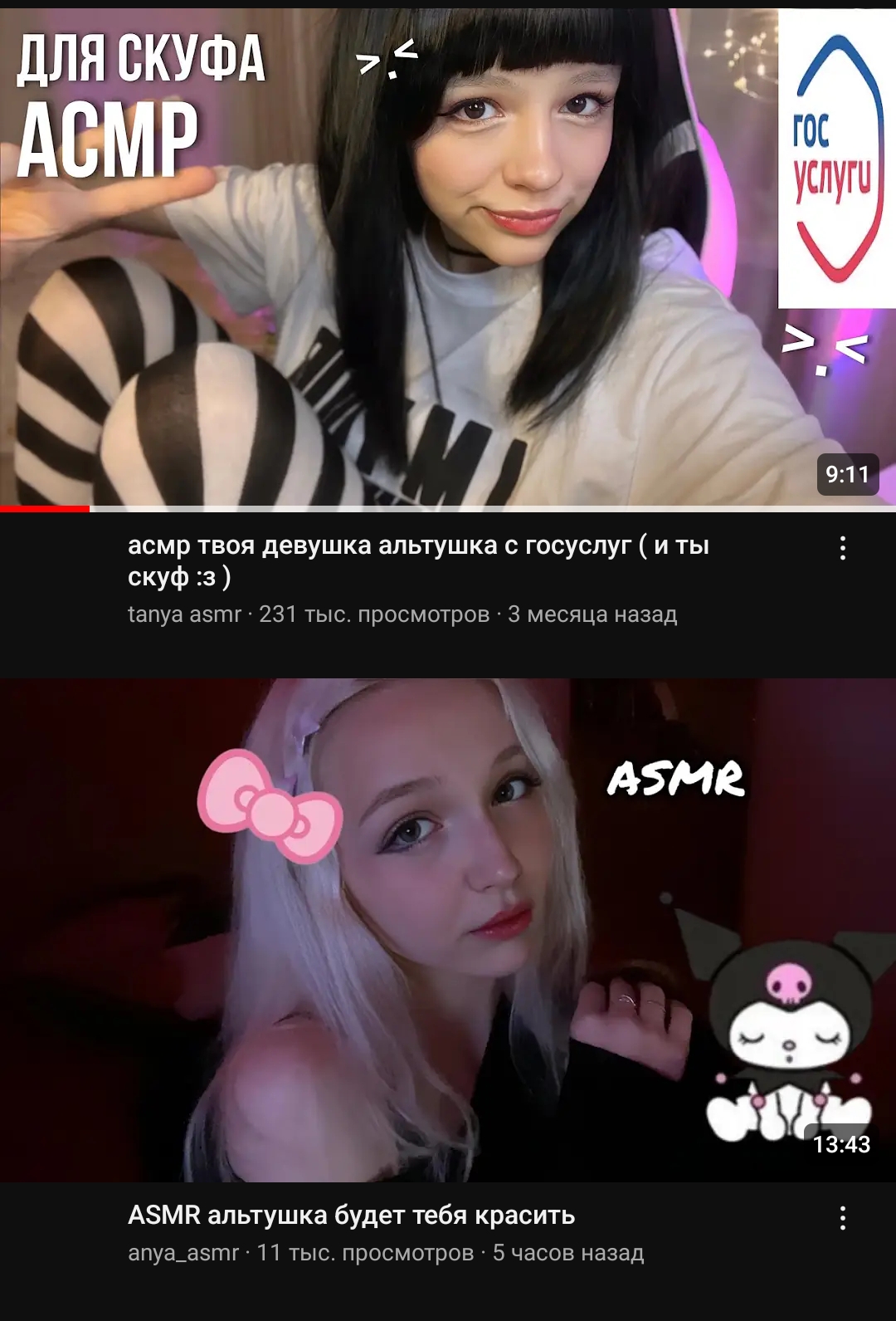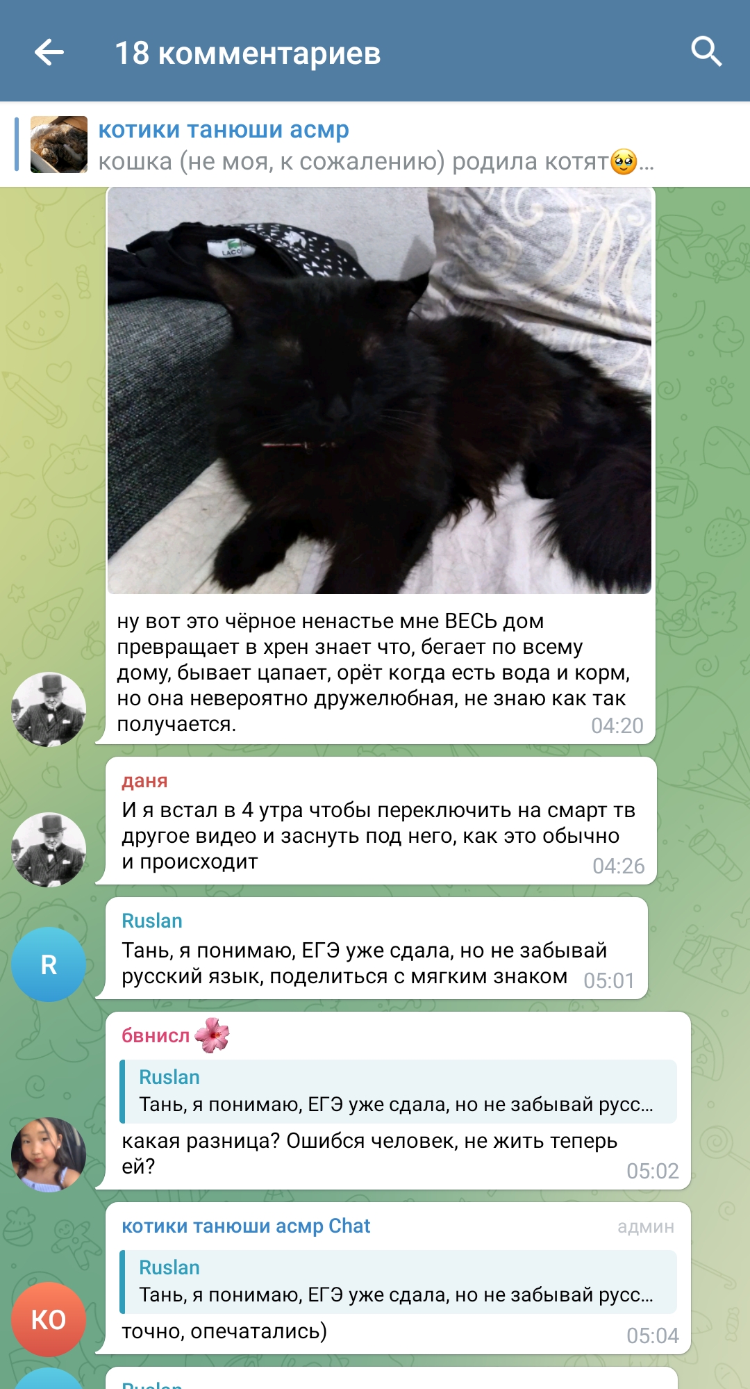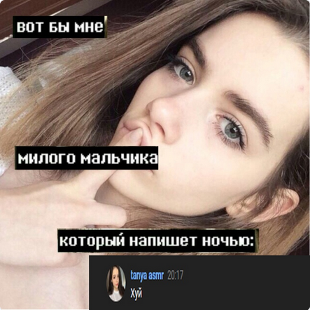 А вобоще Танечка уже взрослая сформировавшаяся фертильная девушка со сформировавшимися вкусами и предпочтениями. Ей удовлетворить свои базовые потребности как грибок срезать. Зачем обсуждать горизонт ее личных отшошений? Там все алмазно. А асмр у нее зачетное (особенно tatti asmr). Смотреть на Танечку - это эстетическое удовольствие высшей формации. P.s.: Ля какой в треде миленький комнатный нахуйпосылатель, кухонный каратист, диванный ниндзя. Аргументы?