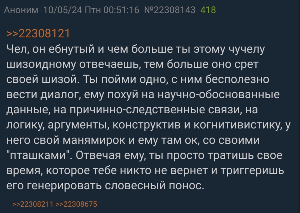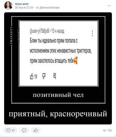 а нет. это какой-то же чел написал. в девочка на защите у Таньки. вот что бывает Таня если нихуя не спать и режима нету. скоро будешь тупой агрессивной и сидеть на дваче.
